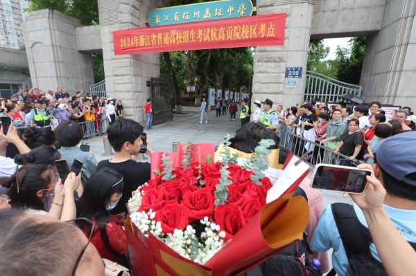 6月7日上午,天公作美,温度适宜,太阳善解人意地躲进云朵里。杭高贡院门口还有丝丝凉风。高考横幅依然鲜红,门楼依旧庄严。