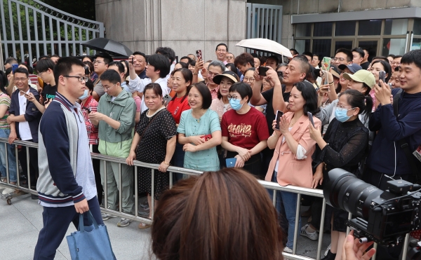 11点38分,一名男生面色淡定地走出来。与一旁等候迎接家长组成的“笑脸墙”形成了鲜明的对比。