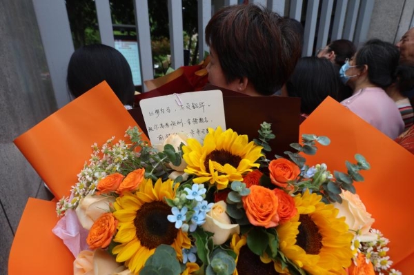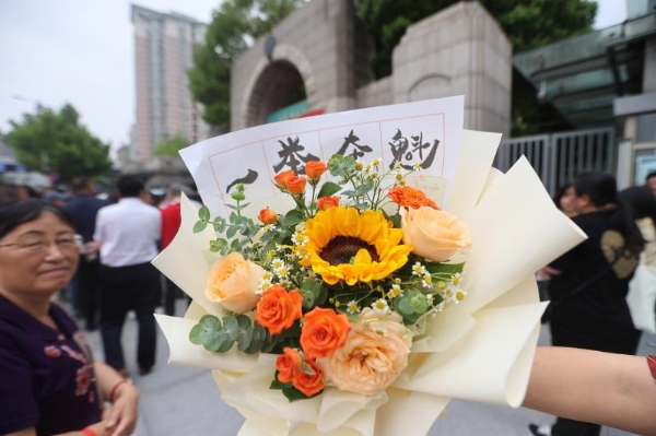 距离高考语文结束还有一个小时,门口并没有几个家长。小婷妈妈一身浅红小白碎花装饰旗袍装,手捧一束鲜花——十来朵玫瑰围簇在一朵更灿烂的向日葵周围,旁边还有一些不知名的小花烘托着,但是,最抢眼的还是鲜花包装纸上“一举夺魁”的毛笔字。