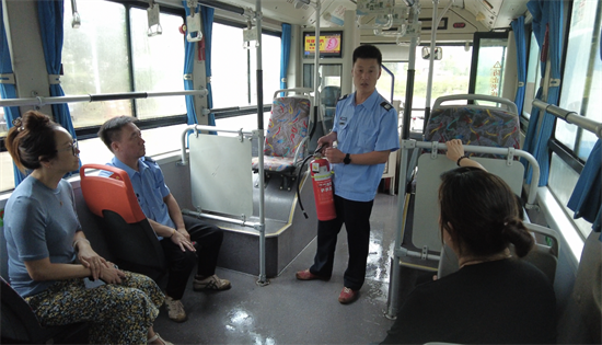 随后,家属们来到公交上,车队副队长叶飞介绍灭火器的使用方法和车厢内应急逃生的设施设备,让家属们对公交车辆安全应急措施有了更具体的认识。