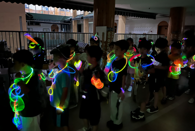 突然间,周围的灯光熄灭了,漆黑一片。“哇,天黑了!”“现在真的都看不见了。”小朋友们并没有害怕,因为在黑暗中,一根根荧光棒悄然出现了,孩子们纷纷感叹:“哇,好美啊!”他们在新奇的氛围中开展“星光走秀”“密室探宝”“烛光晚餐”等活动。