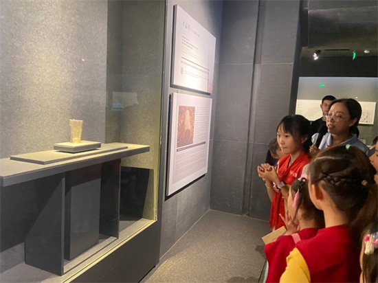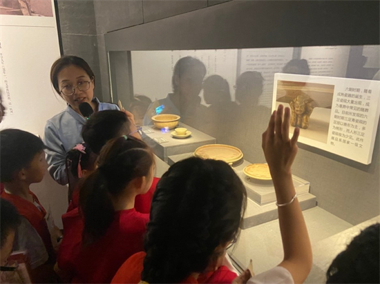 除了参观体验展,小记者们还跟随讲解员参观了杭州博物馆的镇馆之宝:良渚文化玉琮、越王者旨于赐剑、战国水晶杯……小记者们忍不住伸手轻轻触摸展示柜的玻璃,想要更近一步地感受来自远古的震撼。这些涵盖了多个历史时期和不同类型的文物,每一件都承载着深厚的历史和文化底蕴,向公众展示着杭州的悠久历史和灿烂文化。