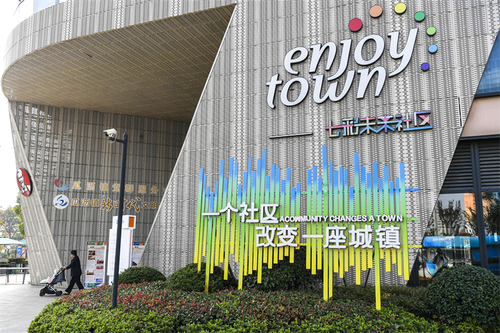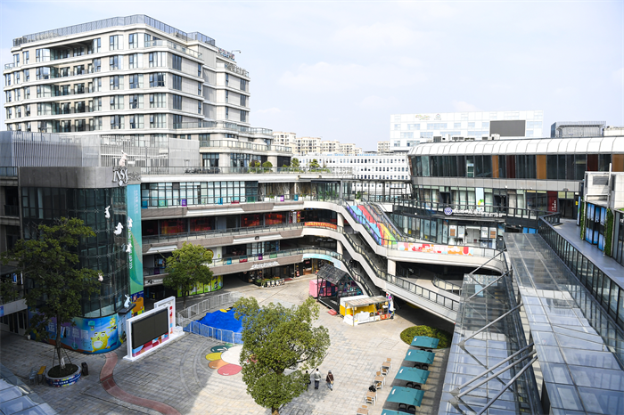高高低低的楼房合围成商业广场,通过连廊和自动扶梯,与错落分布着的小区居民楼及各类餐饮、商业、教育运动等业态连接。一楼是公交首末站,轻松实现“上下楼有电梯,出门有接驳车”,二楼以上是文化客厅、健康生活馆和24小时智慧公共服务中心等配套设施。“想要办事,你上楼就能解决,24小时为你服务。这里,包含了全生命周期的服务。”