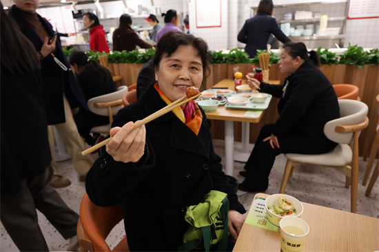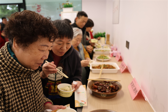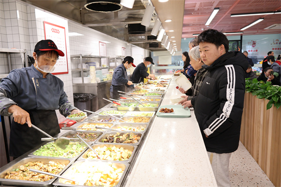 开业当日在食堂里,仅中餐时段就吸引超百名老年居民前来就餐,老人们围坐在一起,一边品尝着美味佳肴,一边畅谈着生活趣事,脸上洋溢着幸福的笑容。正在餐桌前和老伴一起就餐的张阿姨桌上放了4个菜,“家里就我们两人,烧多了浪费,烧少了单调,现在有了食堂可以尝尝好几个菜,色香味俱全,每周菜色还不重样,再也不用担心吃食堂吃到腻了。”