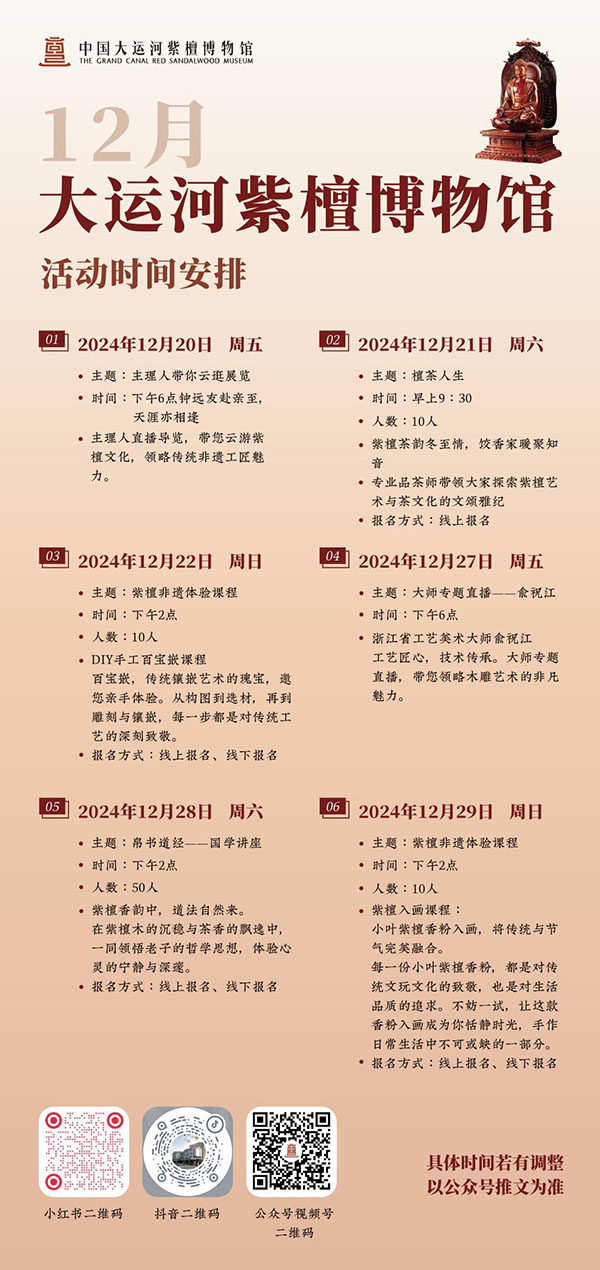 蛇年福字拓印、生命之树祈福仪式、非遗手作互动......一系列节庆与互动的体验也同步上线。观众朋友也以关注大运河紫檀博物馆的官方公众号,通过线上平台轻松获取展览动态、活动预告及深度文化解读,让您的探索之旅更加丰富多彩。