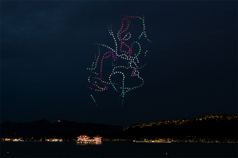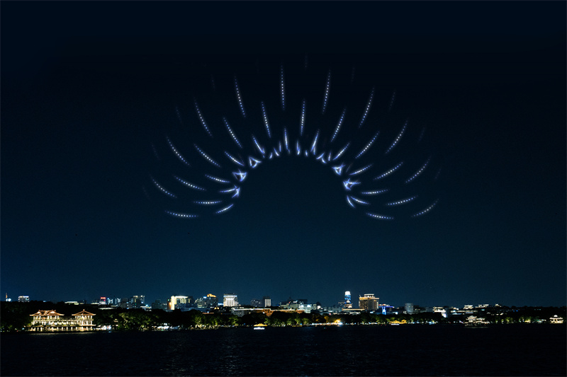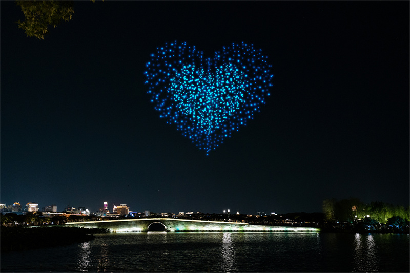当晚的“爱在杭州”主题无人机表演吸引了大批市民和游客驻足。随着时光隧道的闪烁,观众仿佛瞬间穿越到维罗纳。空中,形状逐渐变化的心形城市轮廓,最终汇聚成一颗巨大的爱心,光线的扩展犹如爱意的延续。圆形竞技场的拱门旁,阶梯层层叠加,仿佛诉说着《罗密欧与朱丽叶》的浪漫与悲情;随着两滴泪珠从罗密欧的指尖滑落,从朱丽叶的眼角滑落,涟漪般的光影激荡开来,爱情的颂歌久久回荡在人们心间。接着,《梁山伯与祝英台》的故事也在空中上演,梁祝相向奔赴,化为一圈巨大的涟漪,象征着东西方爱情的永恒与深沉。当涟漪中的巨型彩蝶破茧而出,翩然起舞,又化作星光四散,最终点亮夜空,标志着“因爱起缘,爱在西湖”。