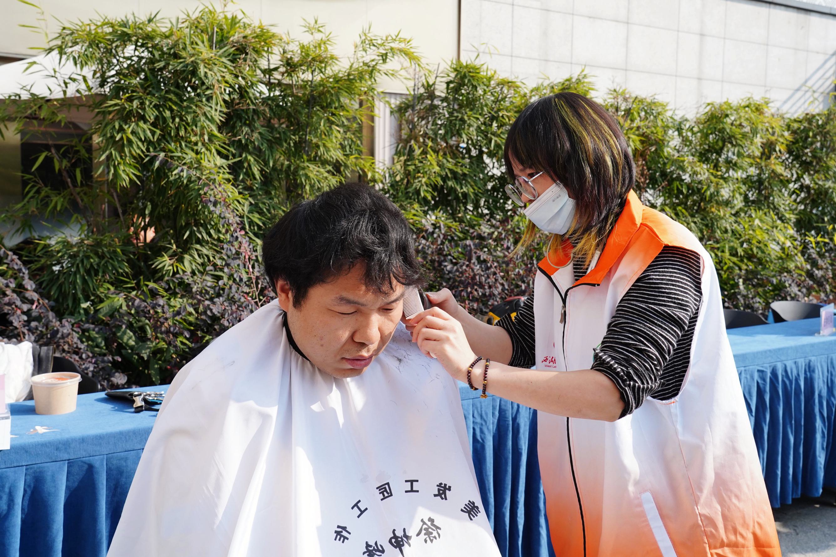 免费理发区,夏师傅精心为小哥修剪发型。“小哥们平时很忙,寒冬酷暑都在外面跑,理发的时间也很少。”她为小哥解开围脖,扫去碎发,“看到他们满意的笑容,我觉得自己的工作很有意义!”