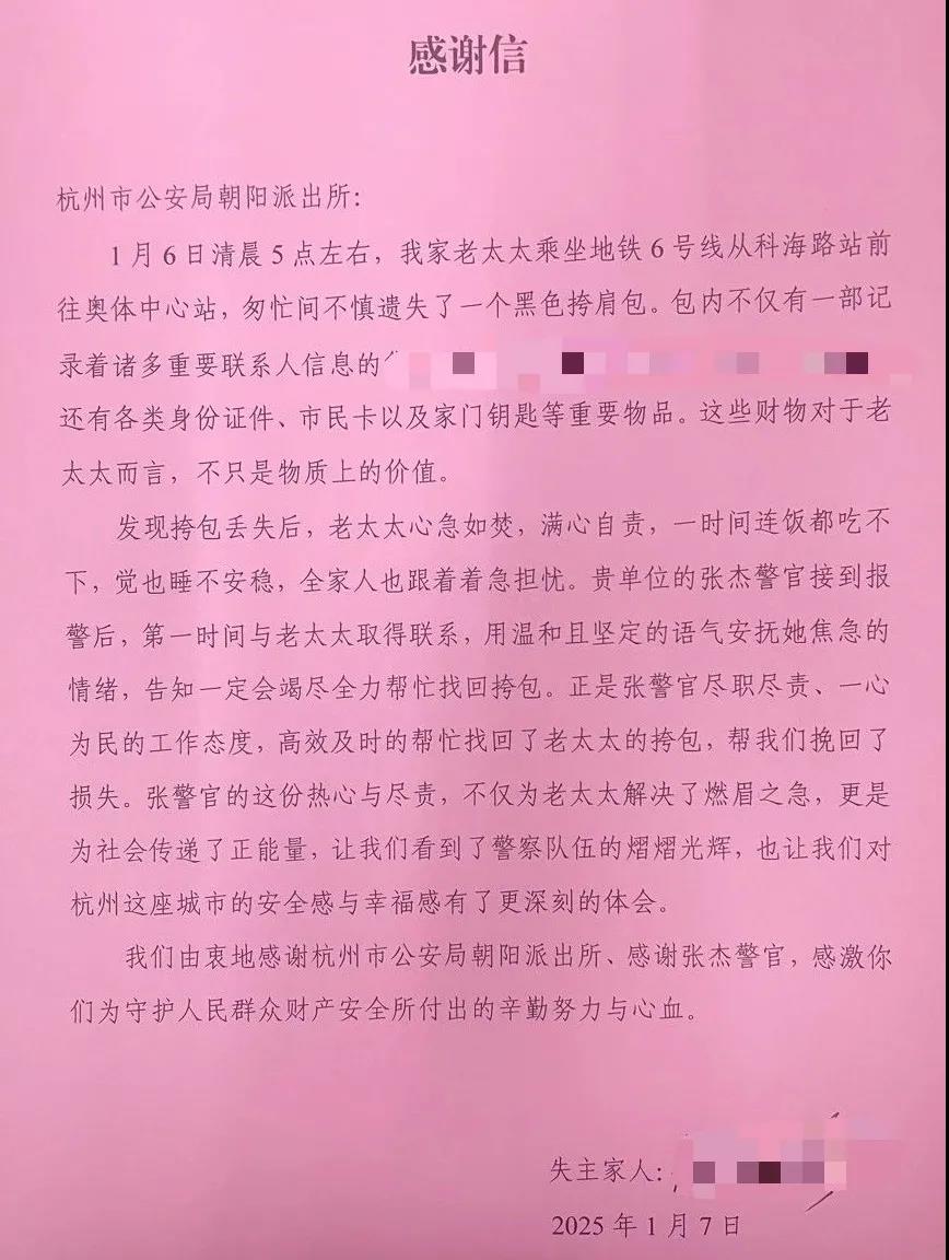 1月8日下午,杭州的缪女士特意将一封感谢信和一面锦旗送至地铁奥体中心站警务室。