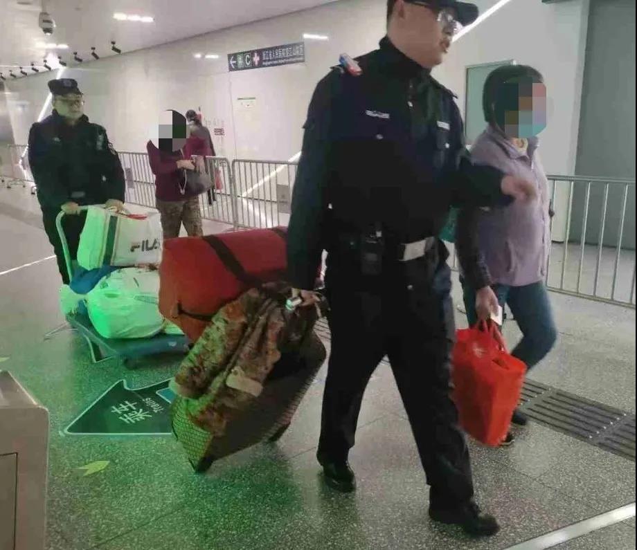 经了解,两位阿姨是一同来杭务工的老乡,临近年关准备一起回安徽老家过年。但因行李过多,两人正商量怎么把行李运下去。金智超见两位阿姨大大小小的行李共有9件,马上联系特保队员,让其拉来站里送货的小推车,两人一起帮阿姨们搬运行李,送她们进站乘车。