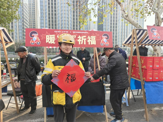 “我还是头一回用毛笔写‘福’字呢,新的一年,祝愿大家福星高照、顺顺利利。”举着亲手书写的“福”字,外卖骑手小张笑着说道。