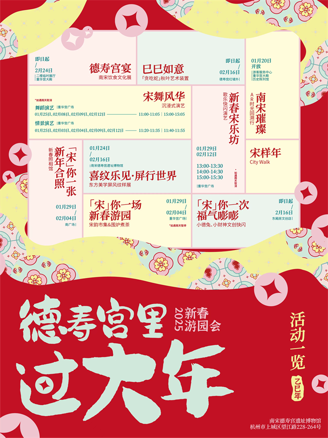 春节期间,德寿宫围绕“德寿宫里过大年”主题,还为市民游客准备了丰富多彩的新春活动,包括宋韵市集、围炉煮茶、新春照相馆等体验类活动,宋舞风华、新春宋乐坊等歌乐表演,“德财所愿”文创快闪以及落叶“贪食蛇”“‘宋福’杭州年上墙计划”等美陈装置,让游客在游玩中感受“宋样年”的独特韵味。