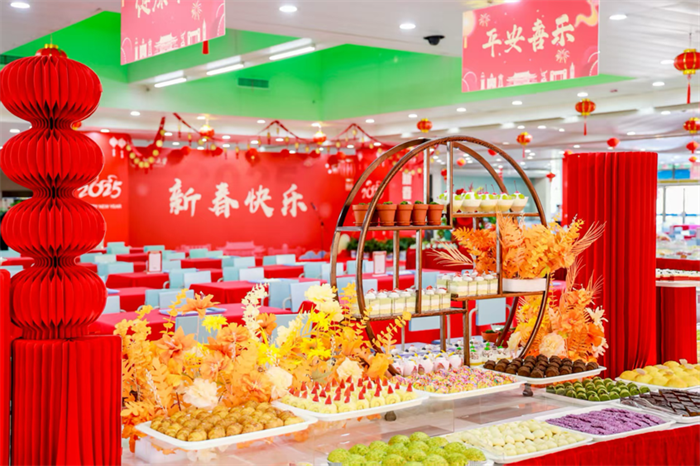 华灯初上,火热的年夜饭在大食堂二楼准点开席。红火的装饰烘托起浓厚的新年氛围。蛇年主题的六层大蛋糕在中心,两边是108道自助餐品。东坡肉寓意红红火火,酒酿圆子寓意团团圆圆,香煎带鱼寓意年年有余……每道菜名以食材为灵感,被赋予了独特的祝福寓意。