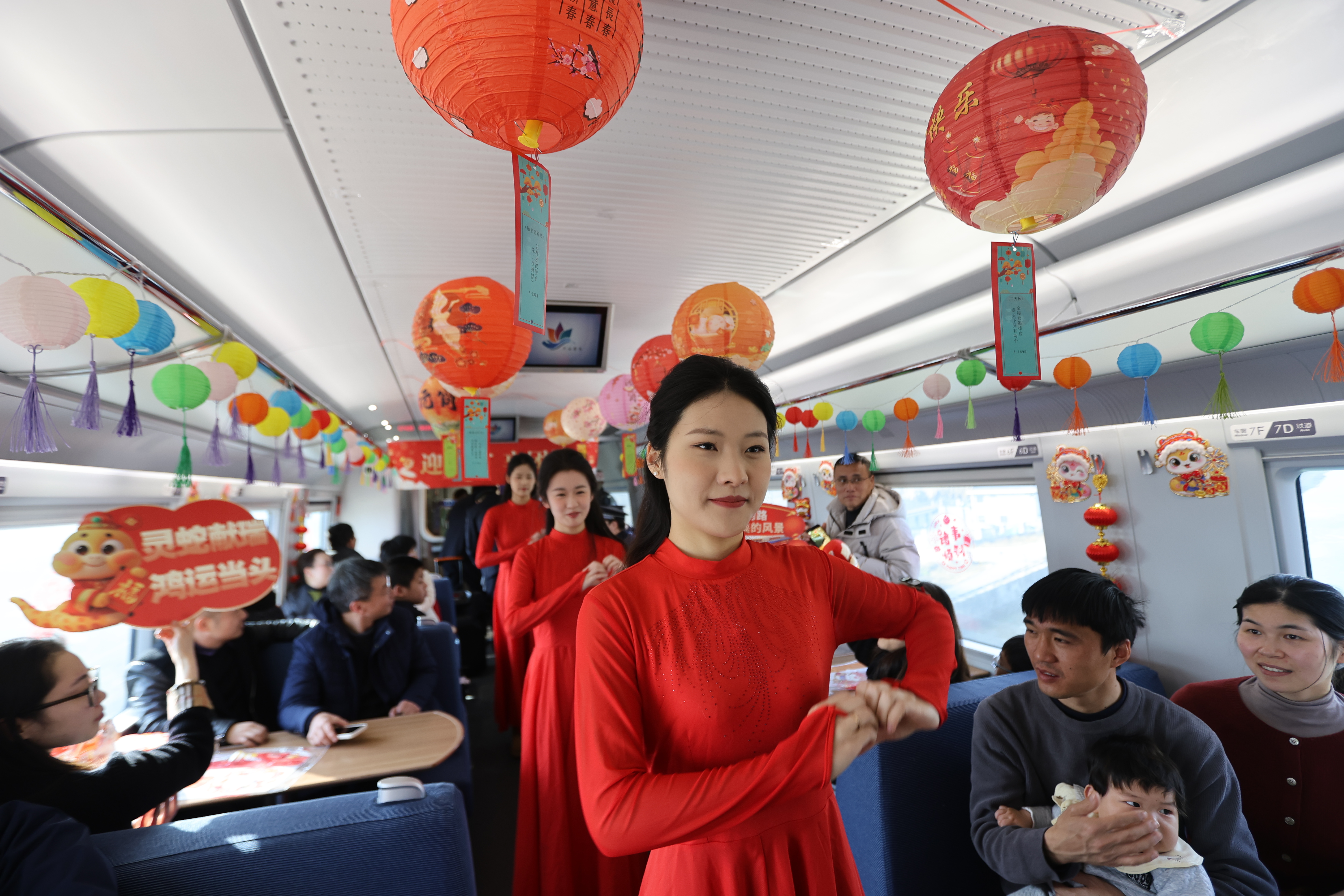 随后,列车工作人员带领大家一起跳起欢快的手势舞,简单易学的动作吸引乘客纷纷参与,原本略显严肃的车厢顿时充满欢声笑语。工作人员还一展歌喉,带来动听的歌曲演唱,赢得阵阵掌声。