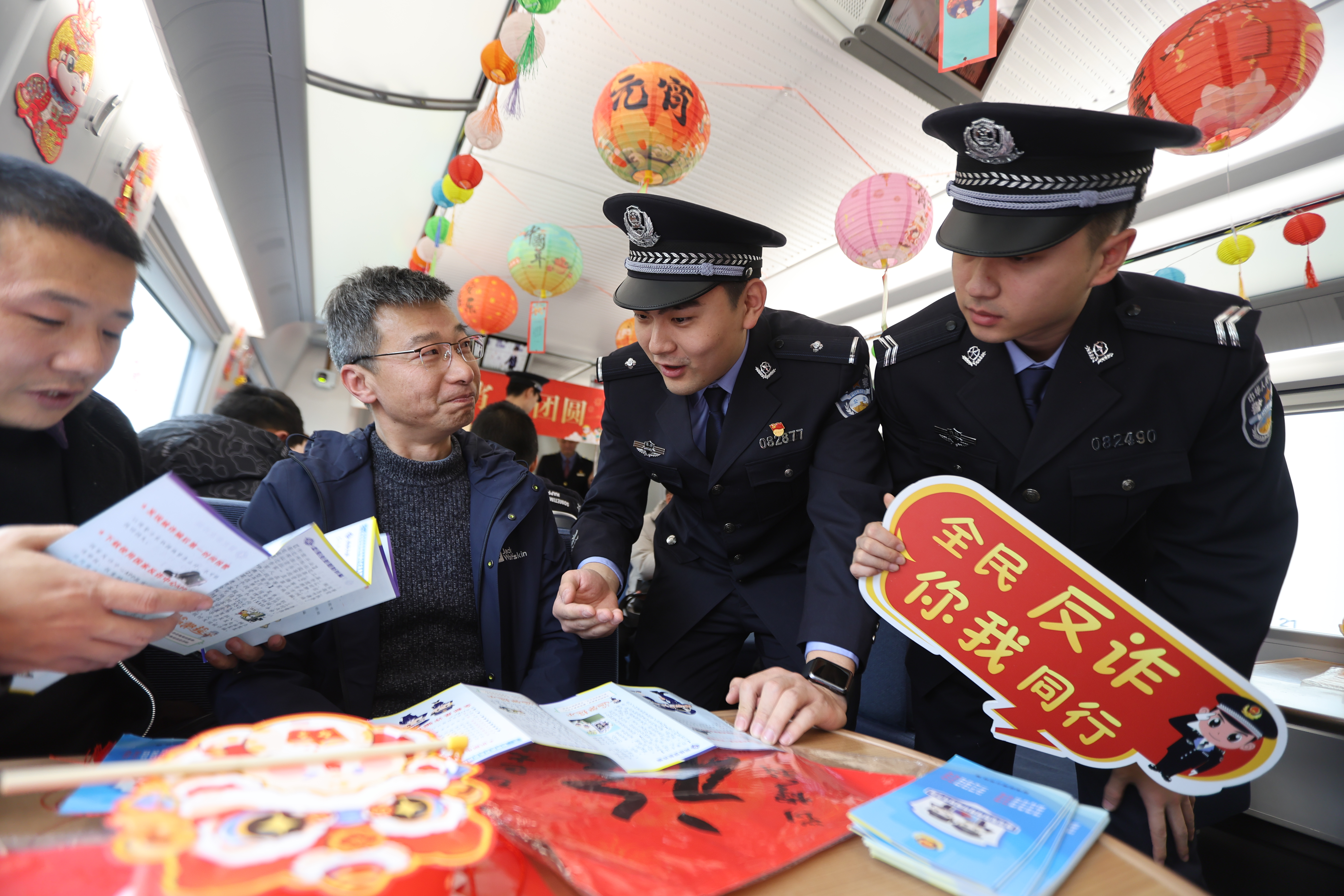 活动不仅有精彩的文艺表演,还融入了实用的知识宣传。杭州乘警支队乘务五大队的工作人员带来反诈快板节目,以朗朗上口的形式向乘客普及反诈知识,提醒大家在享受节日欢乐的同时提高警惕,防范诈骗。接着的普法宣传环节,工作人员用通俗易懂的方式讲解日常生活相关的法律知识,让乘客在轻松愉快的氛围中增强法律意识。