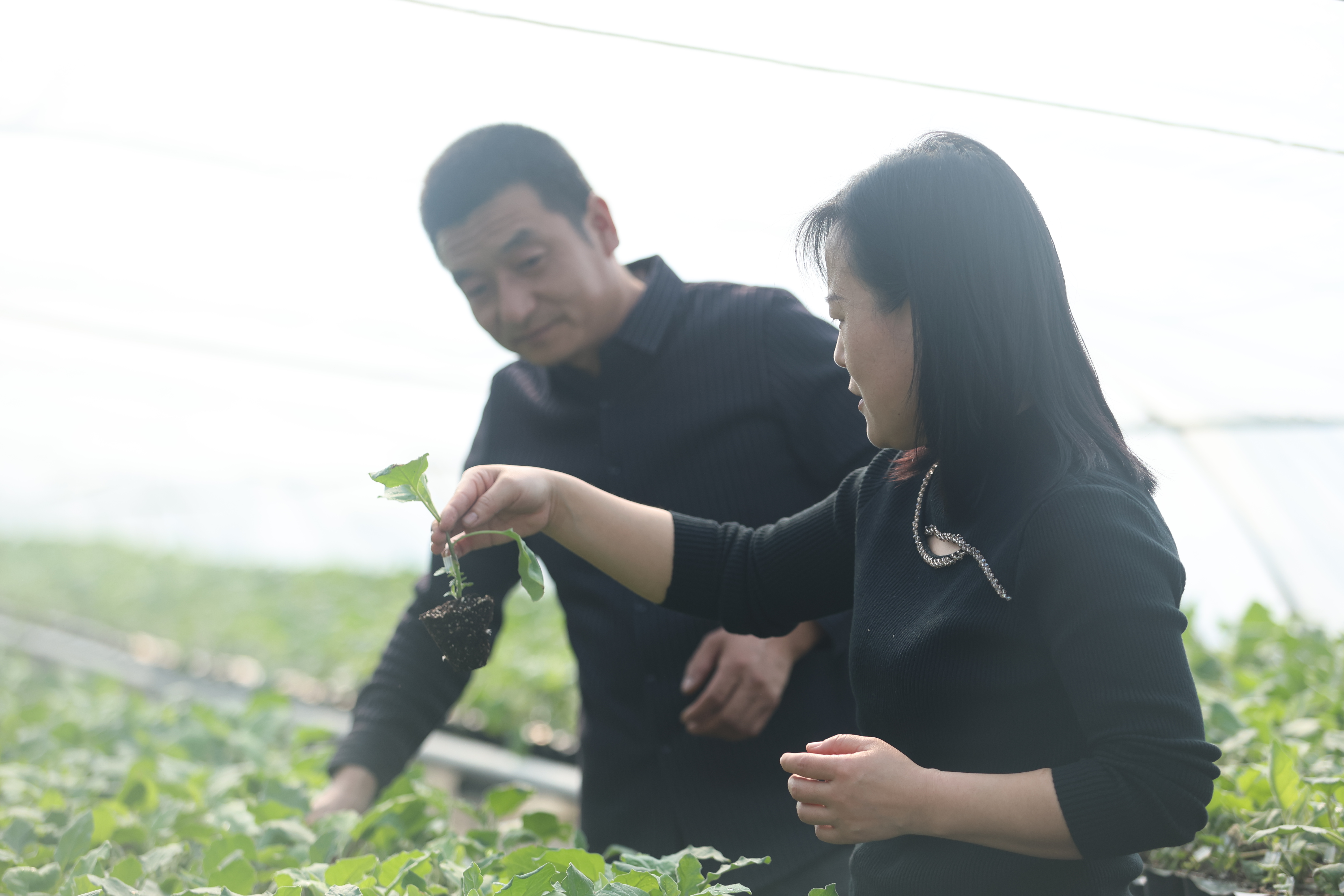 李康正和爱人张乃平查看茄子幼苗的生长情况。