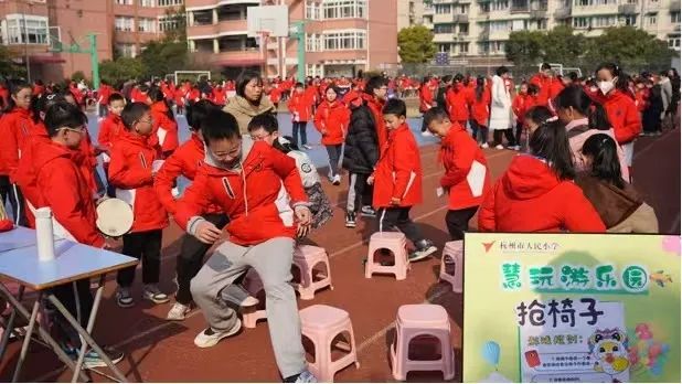 杭州市人民小学也全面升级了课间15分钟活动。在操场上,24个精心装扮的游戏摊位有序排列,宛如一条欢乐的长廊。游戏种类丰富多样,完美融合了体育的活力、智力的挑战和手工的创意。从考验团队协作的趣味接力,到激发思维的益智解谜,再到发挥动手能力的手工创作,每一个游戏在规则设计上都别出心裁,充满了新奇与挑战,吸引着孩子们踊跃参与,在玩乐中尽情释放活力与智慧。