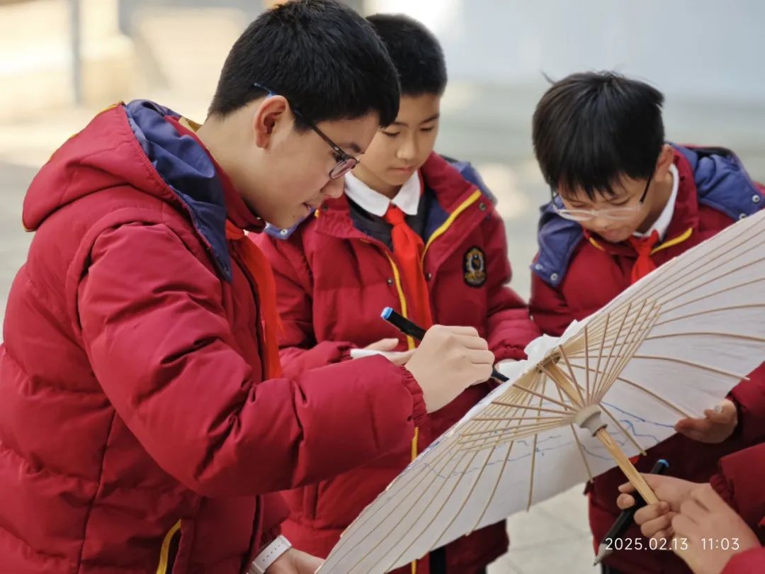 今年央视春晚上,节目《借伞》让西湖绸伞进入大家视野。2月13日,非遗传承人宋小超老师走进杭州时代小学,为同学们详细介绍西湖绸伞的历史渊源、制作工艺等知识。各班同学以小组合作的形式,积极参与非遗绸伞绘制体验活动。三至六年级的同学们还以学校 25 周年校庆为主题进行创作,将对学校的热爱与祝福融入到每一笔绘制中。