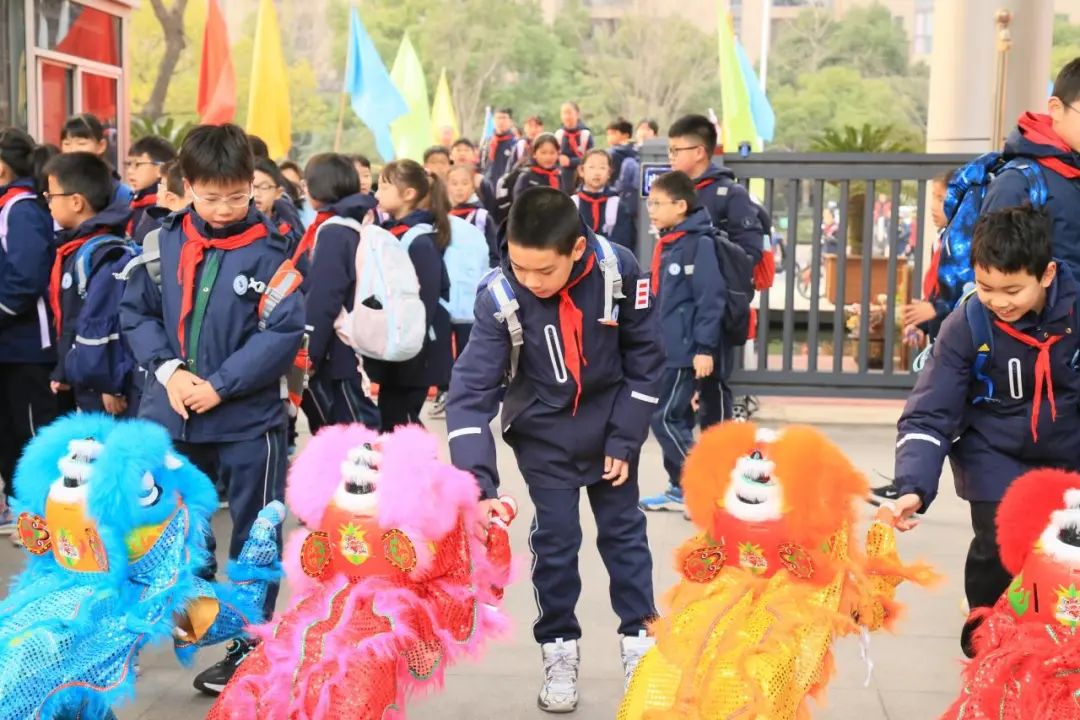 杭州江南实验学校的校门口机器狗装扮成五颜六色的小狮子,化身神兽萌宠,在学校民乐团《金蛇狂舞》的伴奏中,动感起舞,为同学们开启新学期新气象。学生在“幸福江南银杏签”上写下对20周年校庆的诚挚祝福,投入巨型“廿载星愿箱”,在新学期以小主人翁的姿态为学校增添光彩。