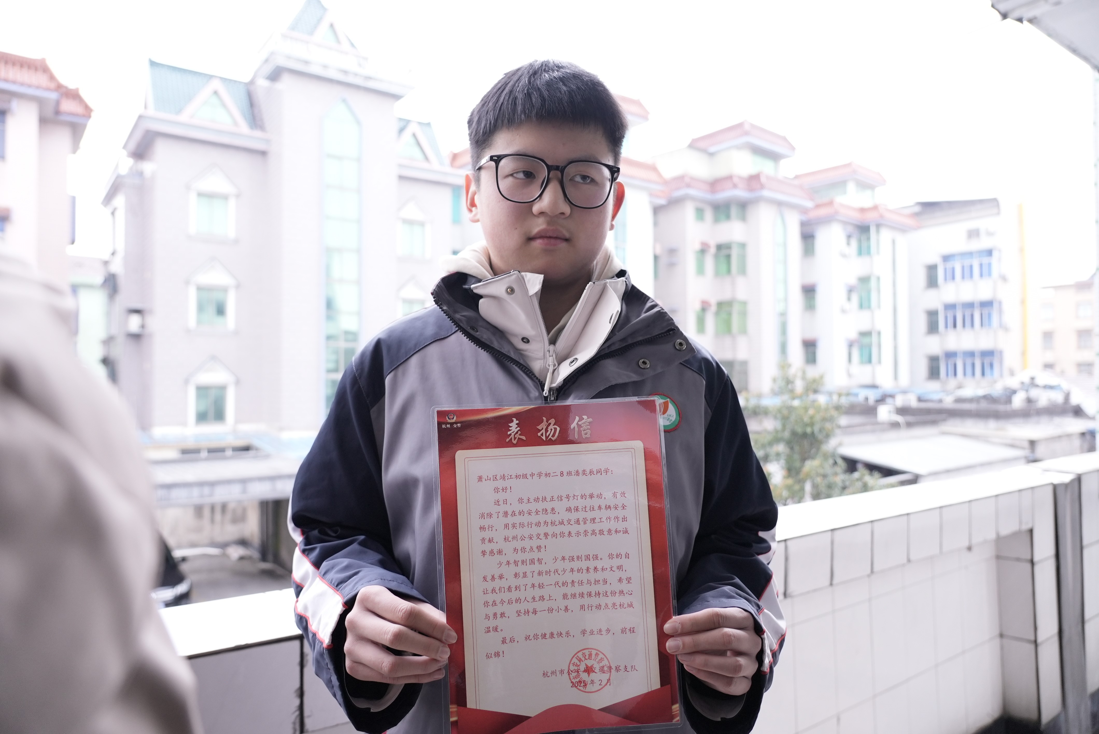 为表彰潘奕辰的这一正能量举动,2月20日下午,杭州交警来到靖江初中,为他送上表扬信,并颁发了“交通安全之星” 奖章,对他用实际行动为杭城交通管理工作作出贡献表示崇高敬意和诚挚感谢。