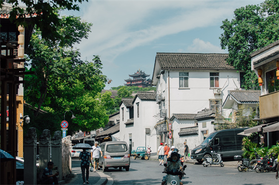 站在“晓霞回望”处,游客可以看到江南的青砖黛瓦、望仙阁的塔尖和盛开的凌霄花,构成一幅绝美的画面。