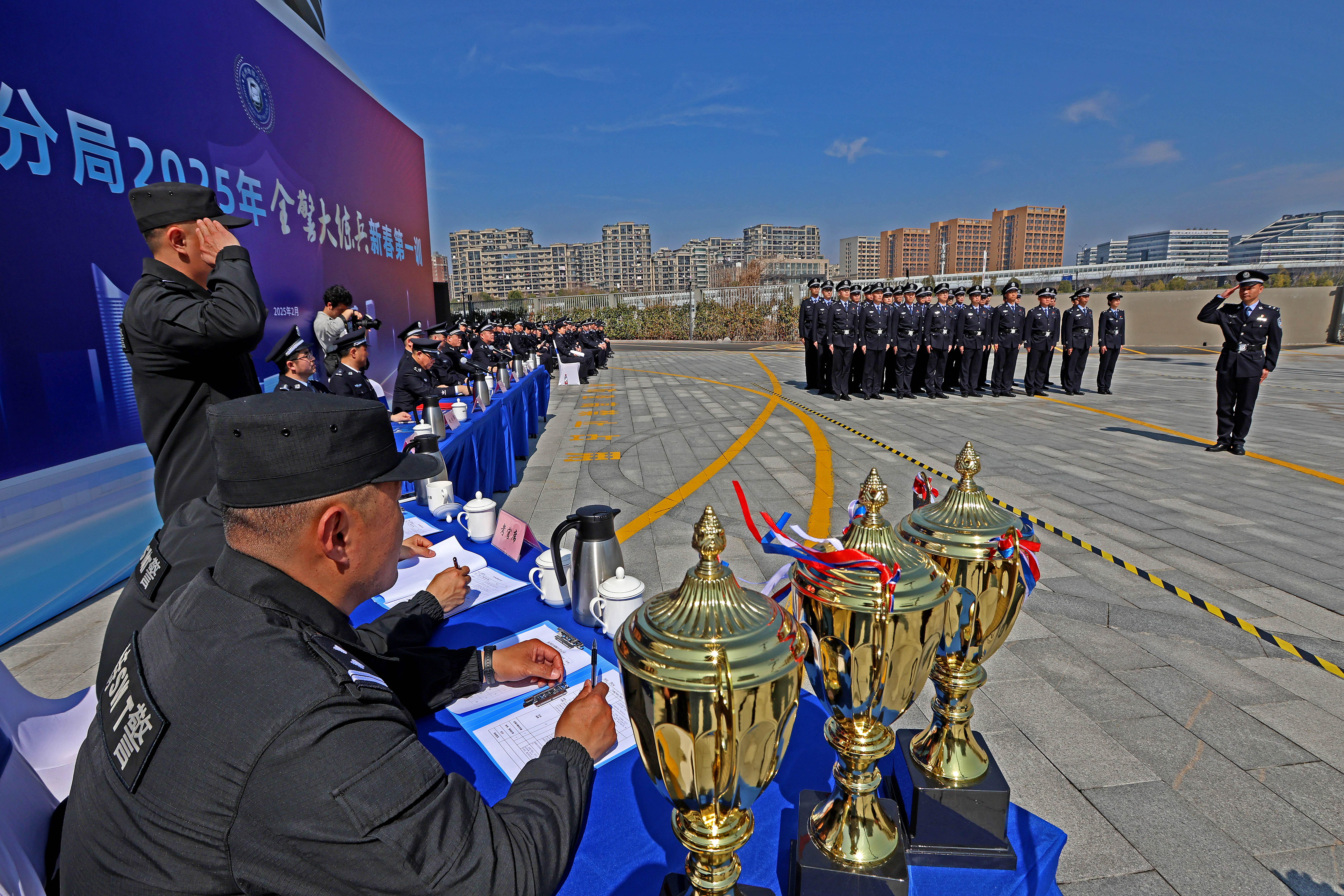 2月28日上午,杭州市七堡车辆段地铁运营公司大楼广场沐浴在明媚的春光下,氛围热烈。杭州市公安局地铁公安分局2025年“全警大练兵”新春第一训活动在这里盛大启幕,全体民(辅)警精神抖擞,意气风发,以昂扬斗志和过硬作风,展现地铁公安的卓越风采。杭州市公安局党委委员、副局长孔万锋,地铁公安分局党委班子成员及各单位负责人齐聚现场,为这场练兵盛会加油助威,共同见证地铁公安迈向新征程的坚定步伐。