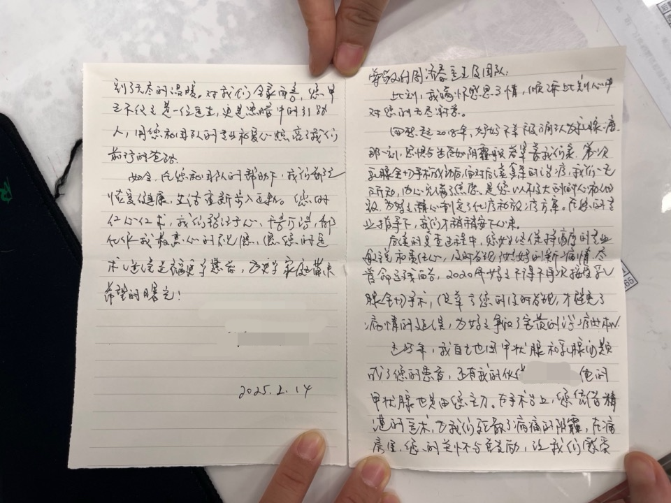 “如今,在您和团队的帮助下,我们都已恢复健康,生活重新步入正轨。您早已不仅仅是一位医生,更是黑暗中的引路人,用专业和爱心照亮我们前行的道路。”这质朴的话语中,字里行间流淌着一家人深深的感激和崇高的敬意。