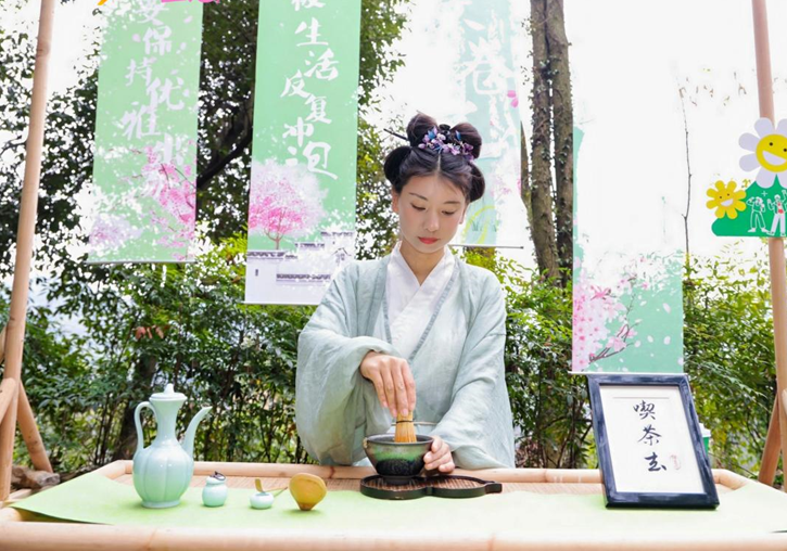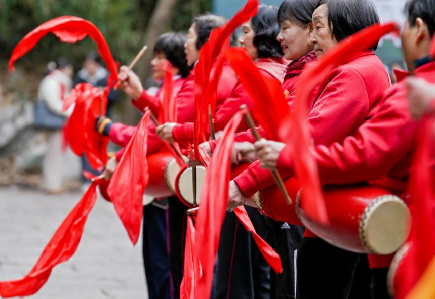 活动现场腰鼓喧天,热闹非凡。嘉宾们佩戴红色围巾,与憨态可掬的机器狗共同登山。沿途,充满古韵的“宋人四雅”体验活动令人陶醉,游客们不时驻足,感受“风炉煮茶、松涛听琴”的雅趣。