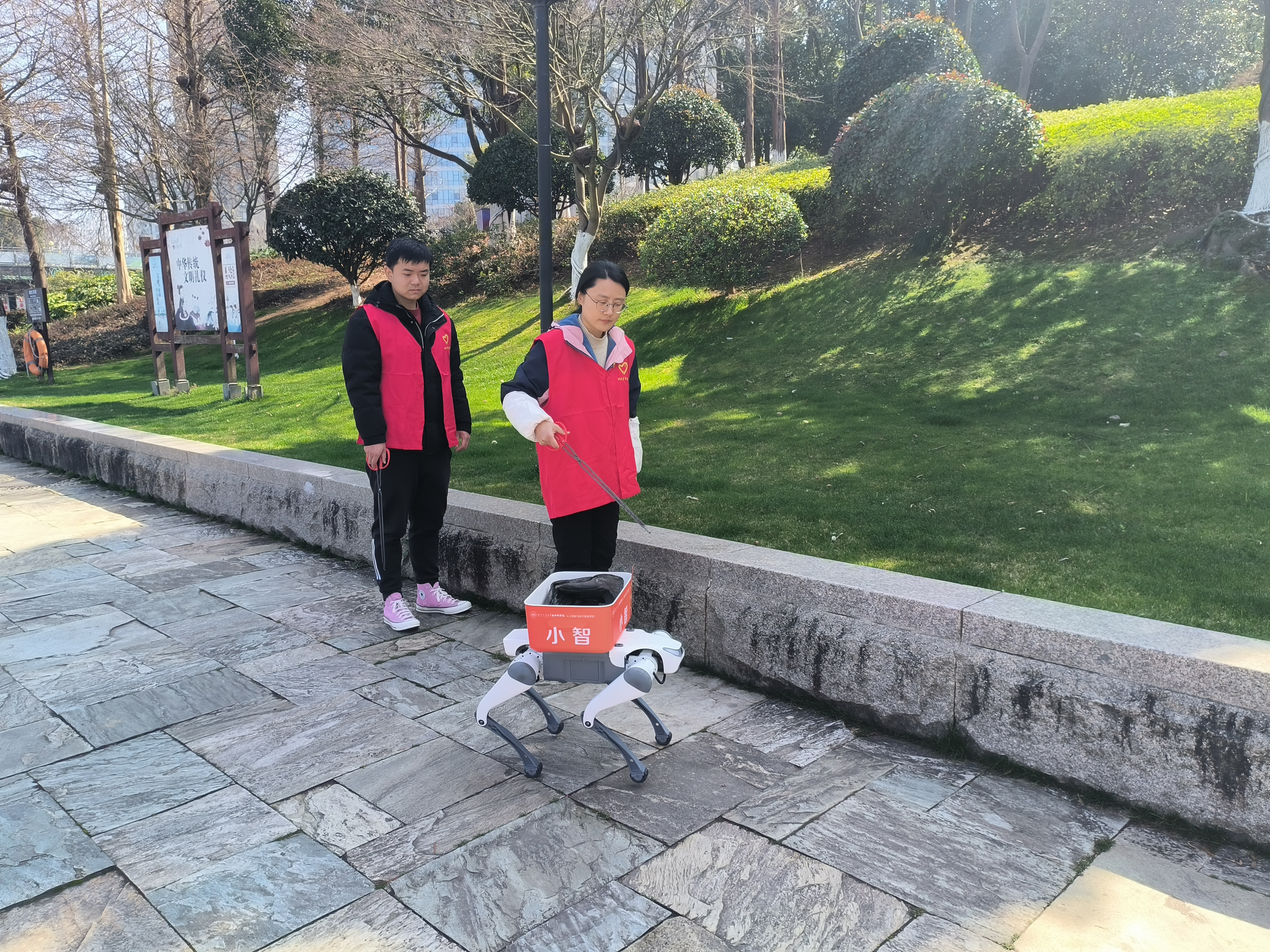 与以往不同的是,此次志愿服务活动迎来了三位特殊的“新成员”——机器狗杭小智、杭小达和杭小易。它们的亮相瞬间成为全场焦点,吸引了众多市民的目光。这三只机器狗是杭商院人工智能与电子商务学院引进的人工智能设备,它们外形呆萌可爱,身披银灰色“铠甲”,配备高精度激光雷达和摄像头,能够灵敏地完成前进、后退、调头等动作,遇到行人还会自动避让。它们的加入为志愿服务注入了科技元素,成为活动中的“团宠”。
