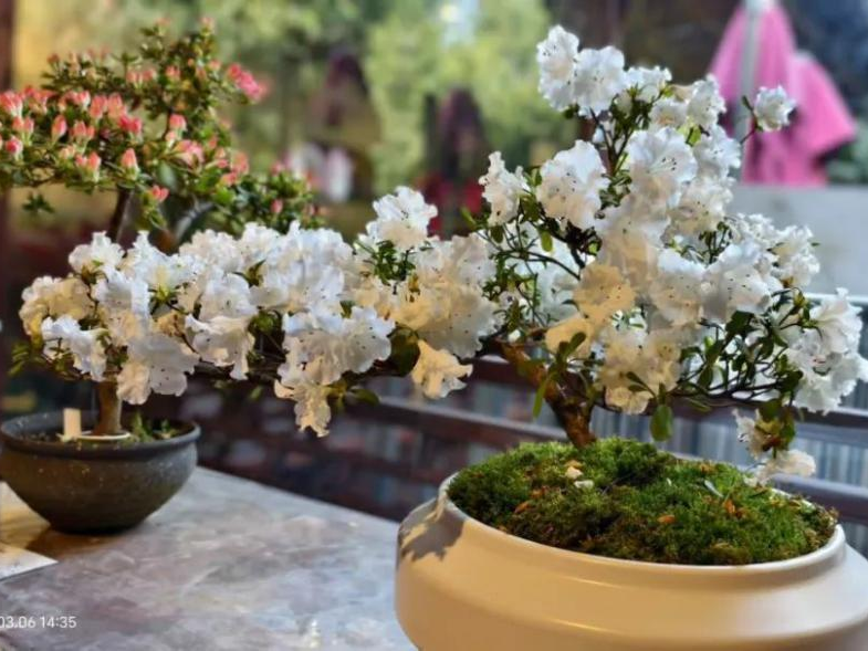浙江嘉善的杜鹃花非遗技能造型盆景,姿态美妙、颜色变化多端,如这盆“鹃之舞”,杜鹃花型圆润似茶花,且每朵花的颜色都有不同。还有从花卉王国荷兰进口的世界顶级红玉珠,颗颗如红宝石般晶莹剔透,吸引了大家的眼球。各类多肉植物、苔玉球盆栽,千姿百态,让人啧啧称奇。