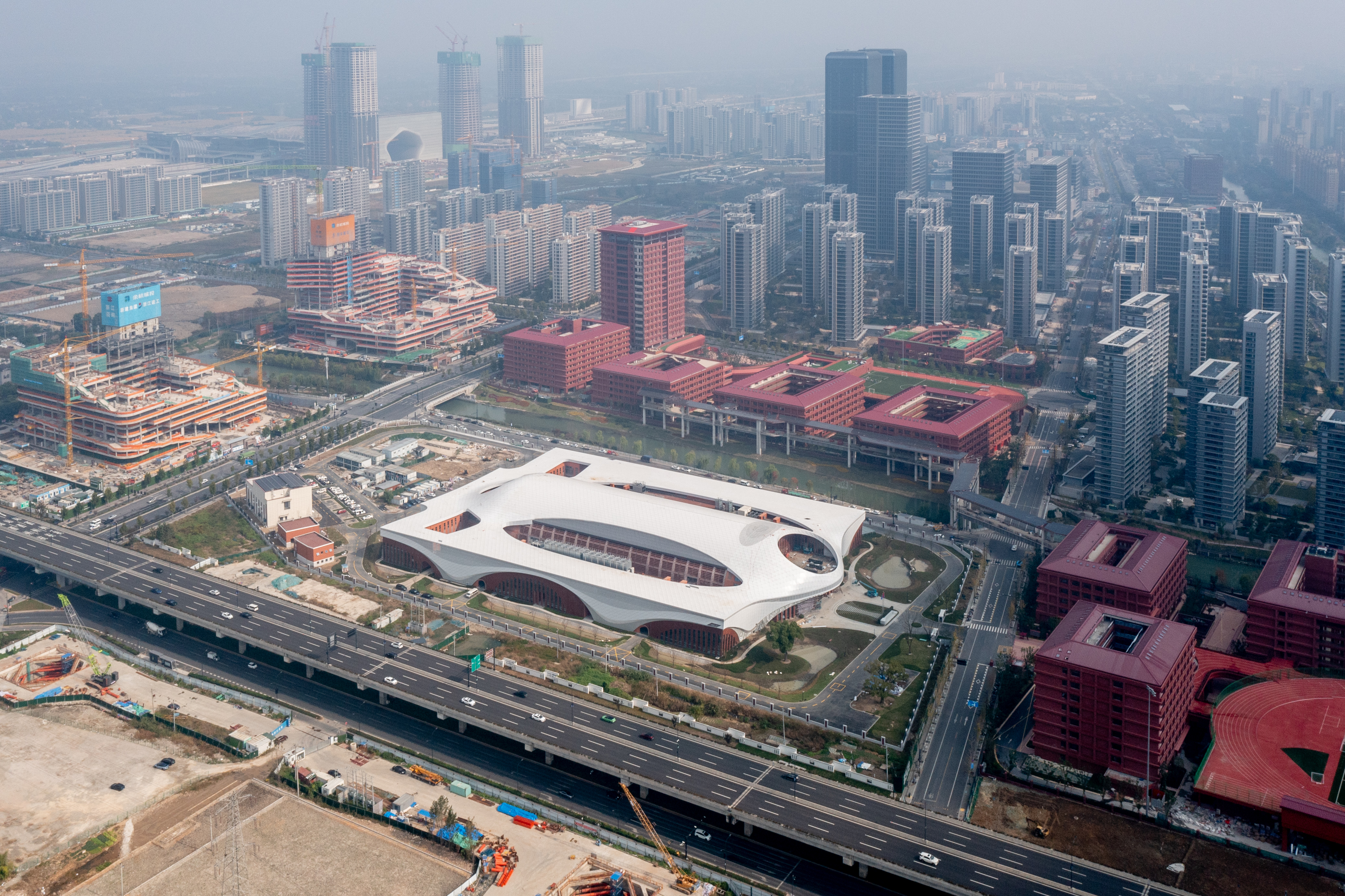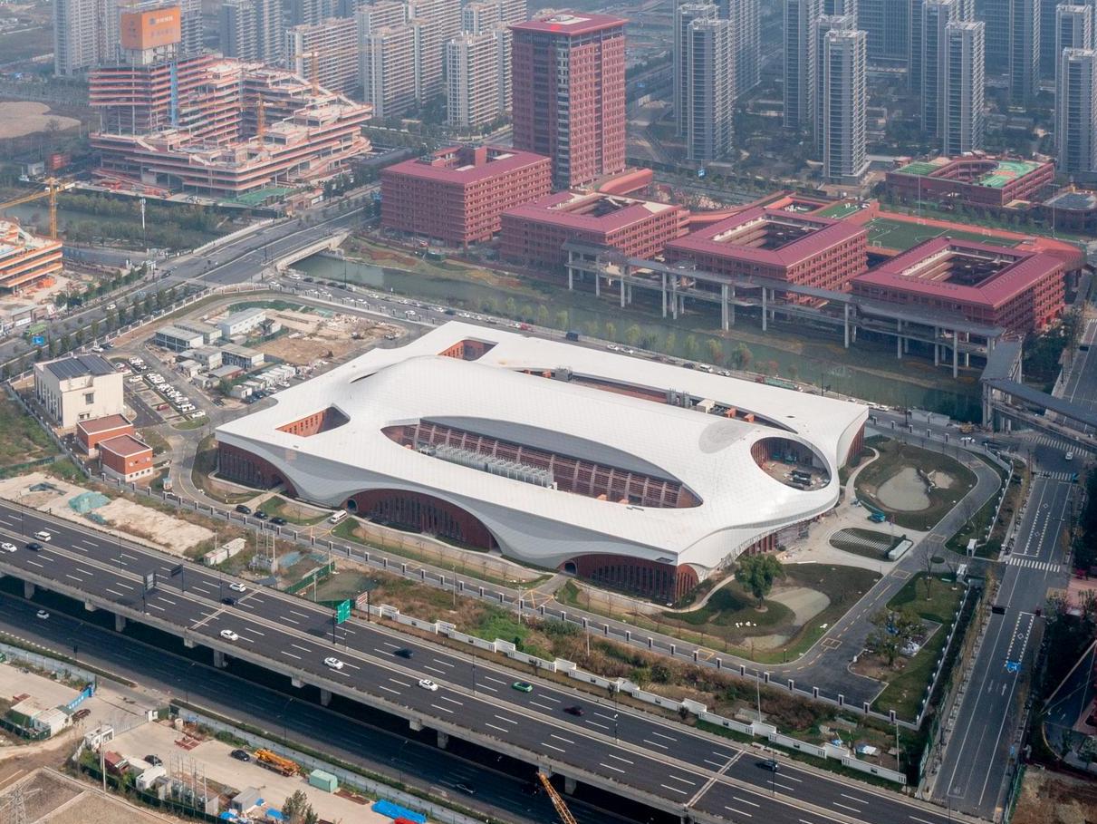 作为杭州未来科技城的地标性建筑之一,超重力实验大楼造型独特,白色的曲面屋顶配以红砖墙身,尽显科技的张力和浙大文脉的传承。