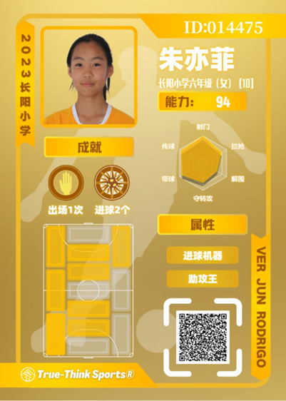 为了鼓励学生们参与足球、喜欢足球,学校还想到了一个奇招——给每位同学定制专属于自己的“球星卡”。从2023年开始,学校的每位校队毕业生都能收到一张专属球星卡,卡片上印着根据比赛数据生成的技能标签,扫描二维码即可回看往期比赛视频。