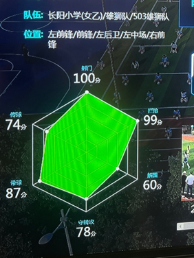 记者来到绿茵场时,正碰上校女子足球队的队员们在进行训练。“现在我的强项是射门,防守和传球还需要加强。”对于“AI足球系统”给出过的分析,五年级的万芊同学记得非常清晰。通过教练手中的系统,记者看到了万同学的“六边形能力图谱”射门分数目前是100分,传球和守转攻分数分别为74分,跟她自己回忆的情况十分吻合。