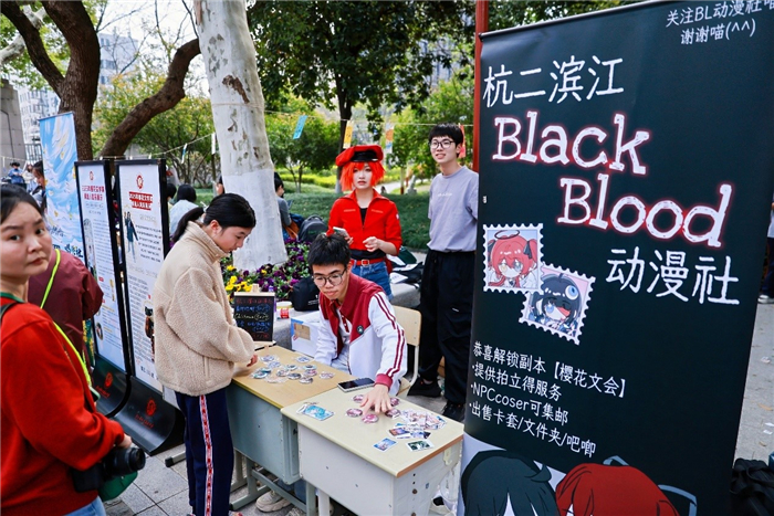 今天下午,在杭高钱江校区,樱花文会同步进行。学校正门前的草坪附近,飞盘社、轮滑社、美术社……众多社团的展示热闹进行着,主舞台上街舞社、音乐社的表演,或悠扬,或激越。