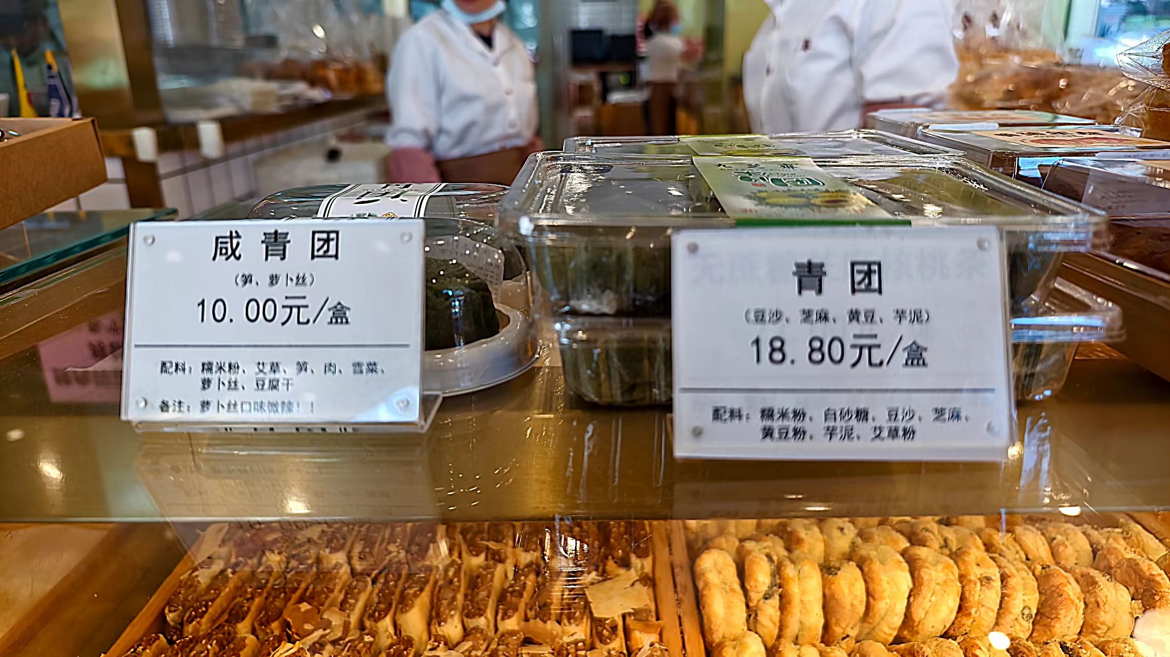 在采芝斋(延安路店),200只手工青团整齐地码放着,分为芝麻馅和豆沙馅两种口味,60g一只,一只3元。江南春(解放路店)则在保持老味道的同时,针对时下流行的口味,开发了海苔肉松、芝士芋泥的新口味。而在佑圣观路的一家西式甜品店里,一款添加了萝卜丝、豆腐干的咸口青团每天限量供应,“一大早就订出去十几份,每天都有近300份可卖的。”