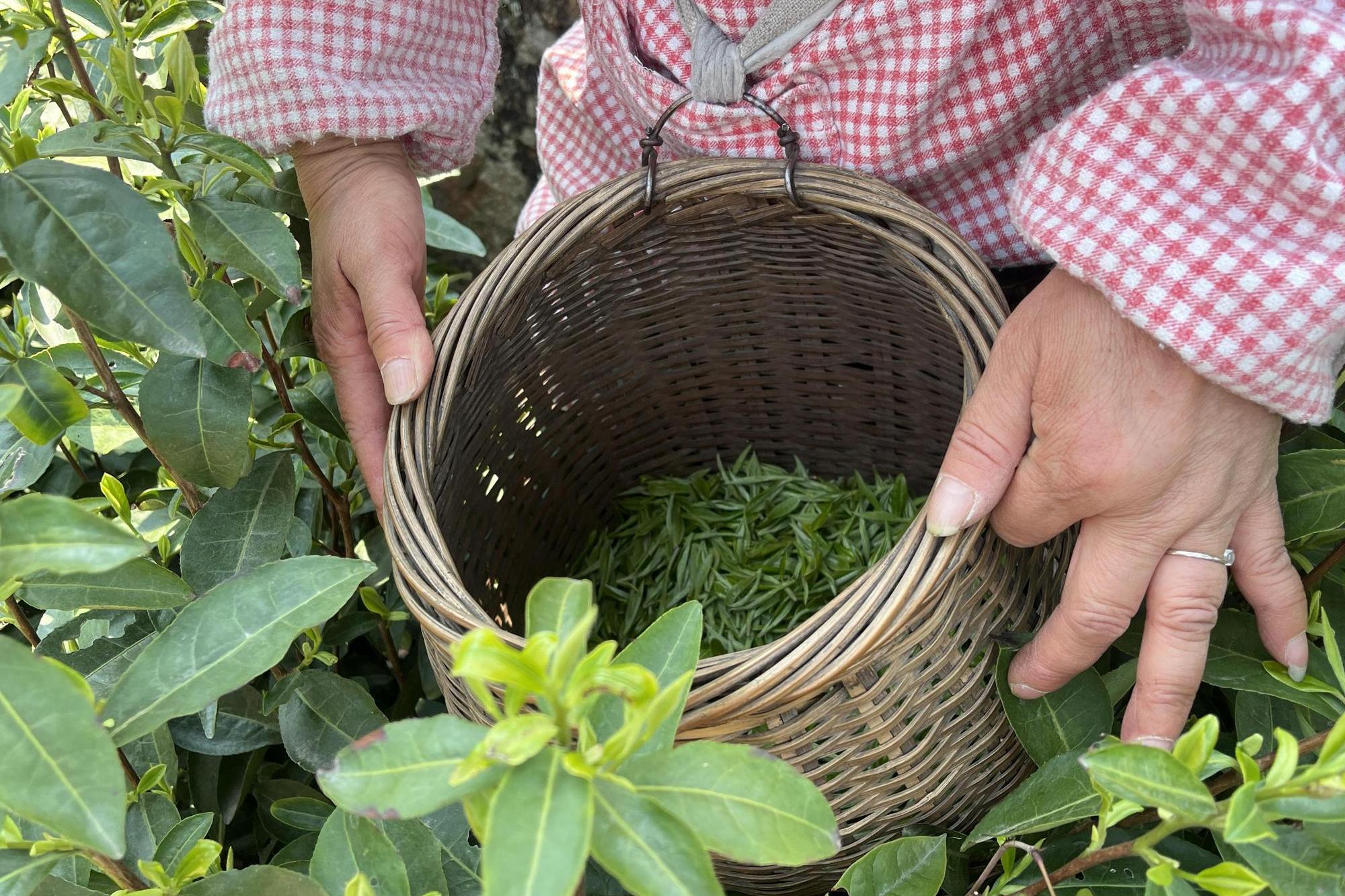 记者来到杭州市余杭区径山镇四岭村的茶园,采茶工们正熟练地采摘着鲜嫩的茶芽,手指轻轻一提,采下标准的“一叶一芽”,轻轻投进腰间的竹筐里。