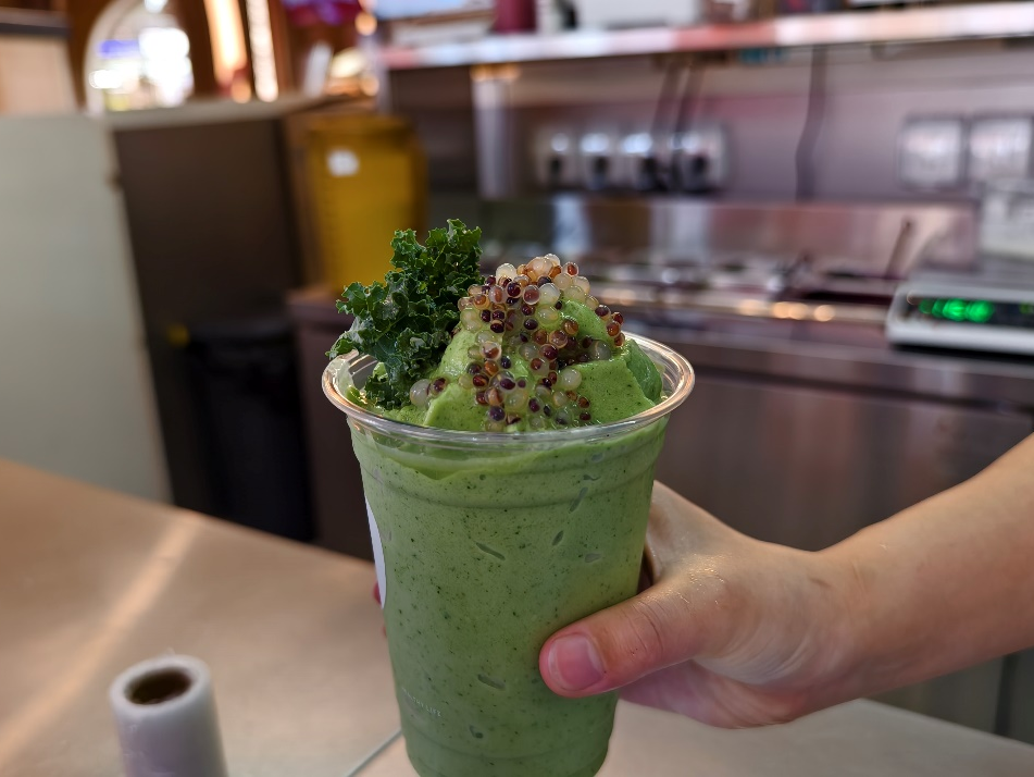 3月30日,在店员小周的建议下,记者点了一杯含有70克羽衣甘蓝的酸奶并告知无需加糖。或许是添加了马蹄爆珠、凤梨酱等风味物质的缘故,饮品并非难以入口。记者注意到,市面上常见的添加羽衣甘蓝饮品的配料表中,蔗糖糖浆占据重要一席。