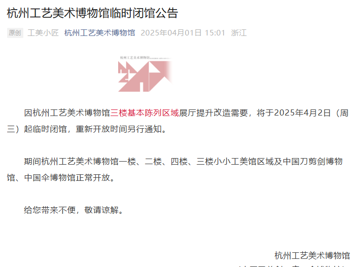 2025年4月1日,杭州工艺美术博物馆发布公告,为优化展陈环境,自4月2日起工美馆三楼基本陈列区域展厅将临时闭馆,重新开放时间将另行通知。杭州工艺美术博物馆一楼、二楼、四楼、三楼小小工美馆区域及中国刀剪剑博物馆、中国伞博物馆正常开放,照常接待游客。
