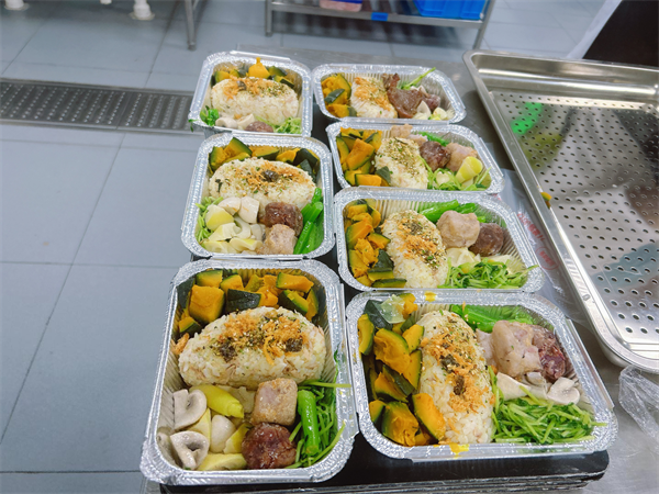 记者走进学校后厨,100份健康餐已经全部制作完成。值得一提的是,每一个套餐的食物种类达到了23种之多,包括大米、藜麦、玉米、芝麻、香芋(姜)、紫薯(蜂蜜)、西兰花、红腰豆、贝贝南瓜、白木耳、春笋、白玉菇、蟹味菇、木耳、口蘑、菜心、豌豆、牛肉、黑胡椒(洋葱、胡萝卜碎)、土豆泥,培根、鸡蛋等等。
