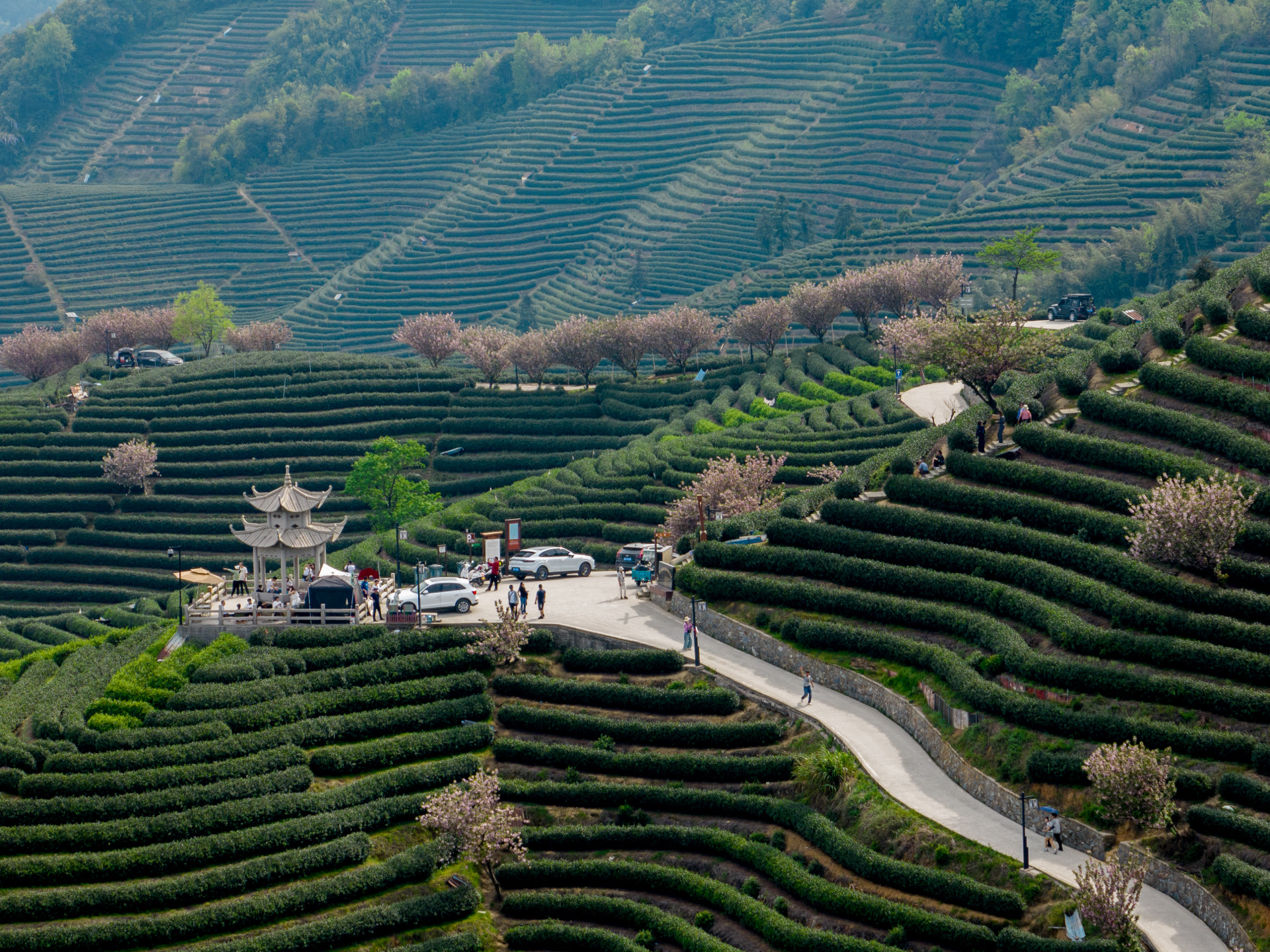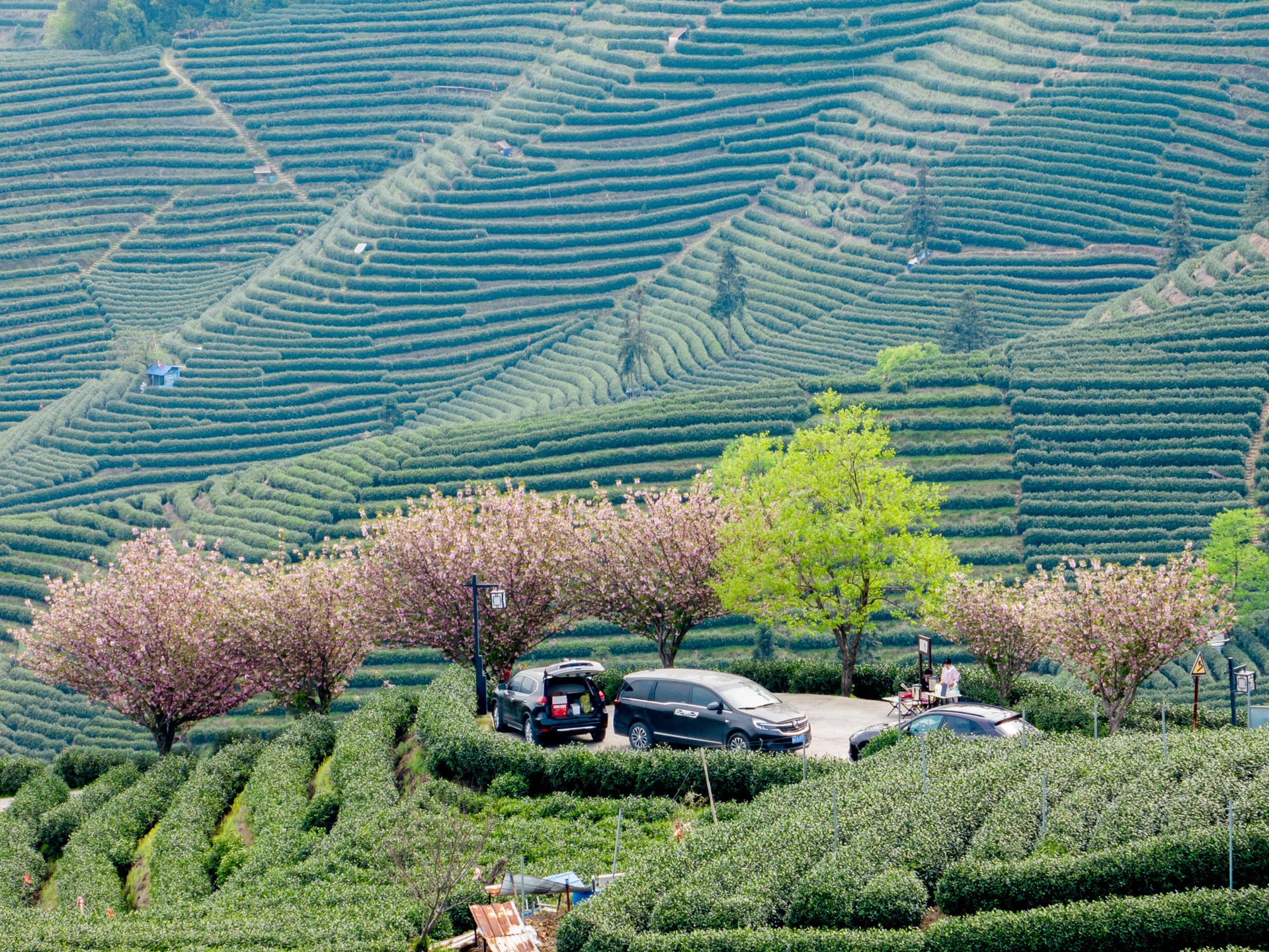 远眺,拔山村茶山山峦起伏,茶园郁郁葱葱,嫩绿的茶芽与粉色的樱花相互映衬,构成了一幅绝美的田园画卷。