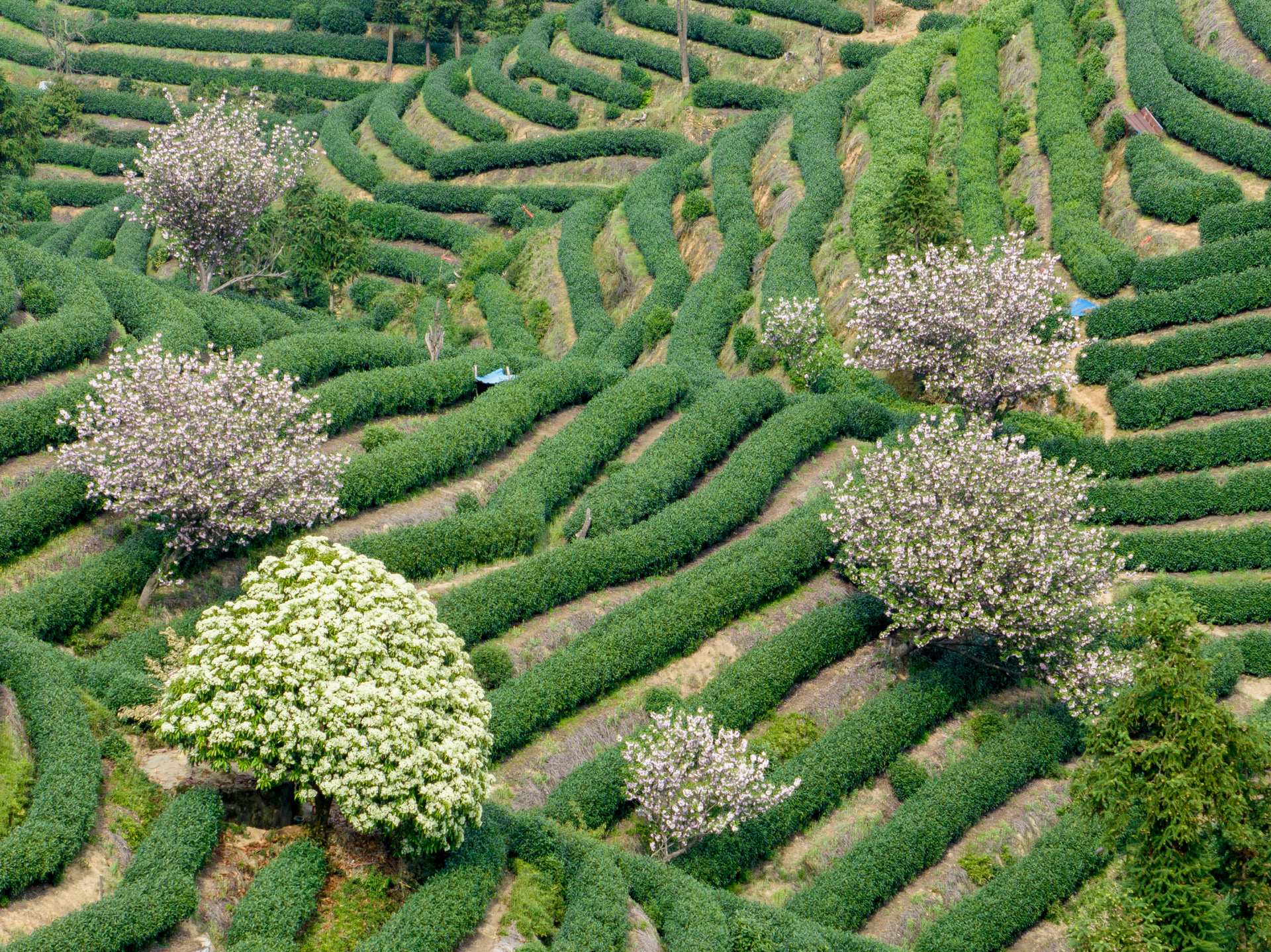 近看,蜿蜒曲折的登山道间,散落的千棵晚樱芳香四溢,可体验“茶山花海、人山人海”的热闹场景,一侧是盛放的晚樱,一侧是生机勃勃的茶园,空气中弥漫着樱花的甜香和茶叶的清新,让人心旷神怡。