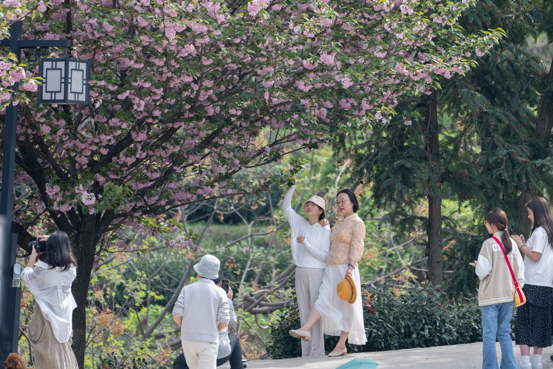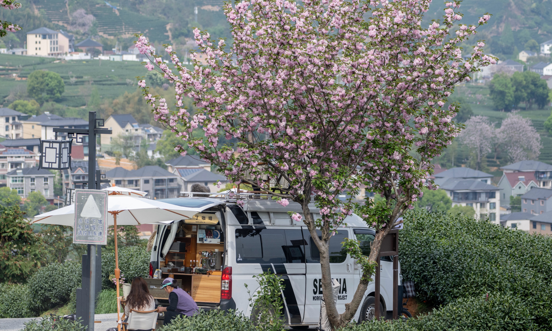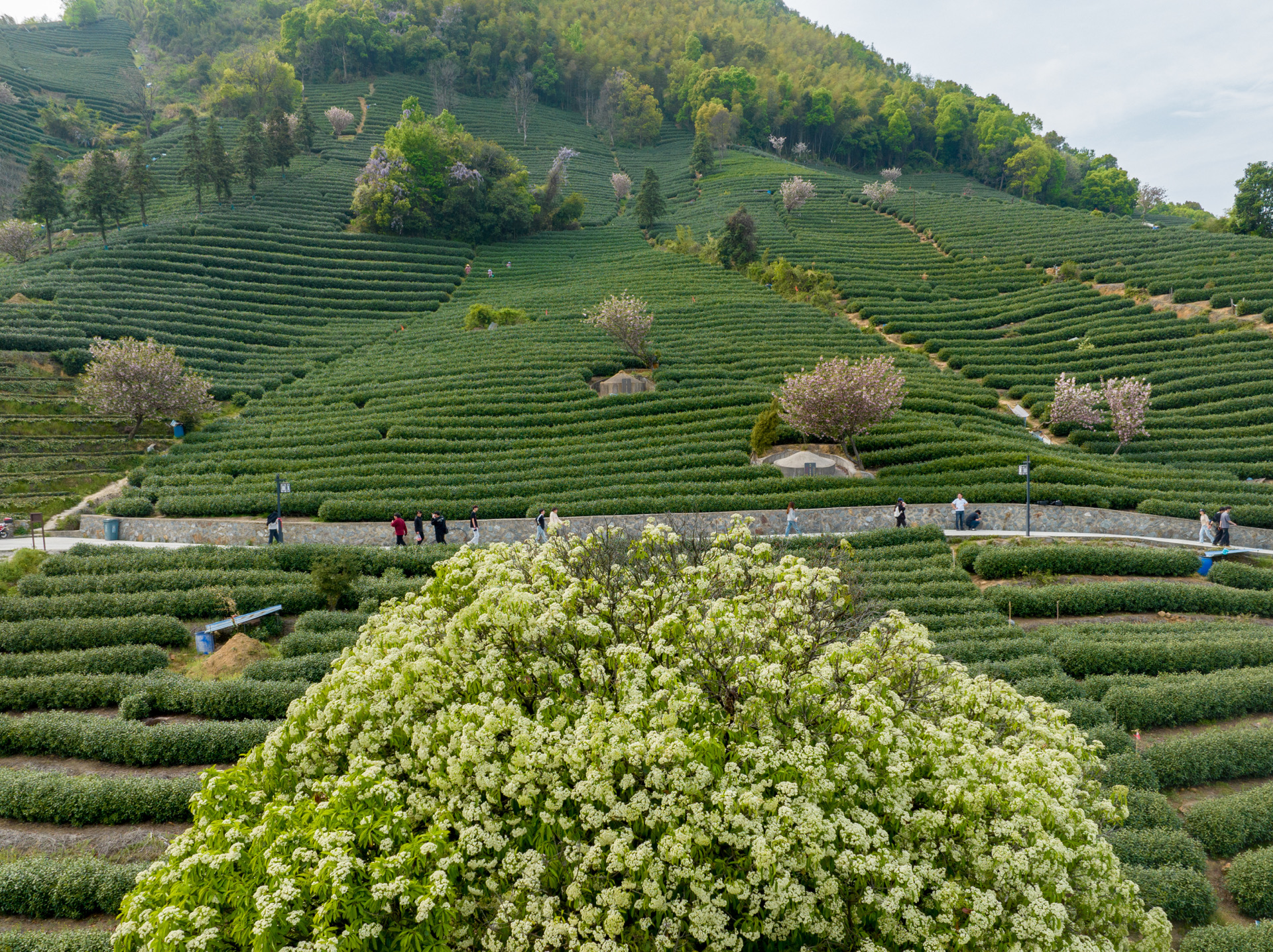 近日,位于富阳区拔山村的龙井茶园内,山间晚樱迎来一年一度的盛花期,吸引了不少游客前来观赏打卡。
