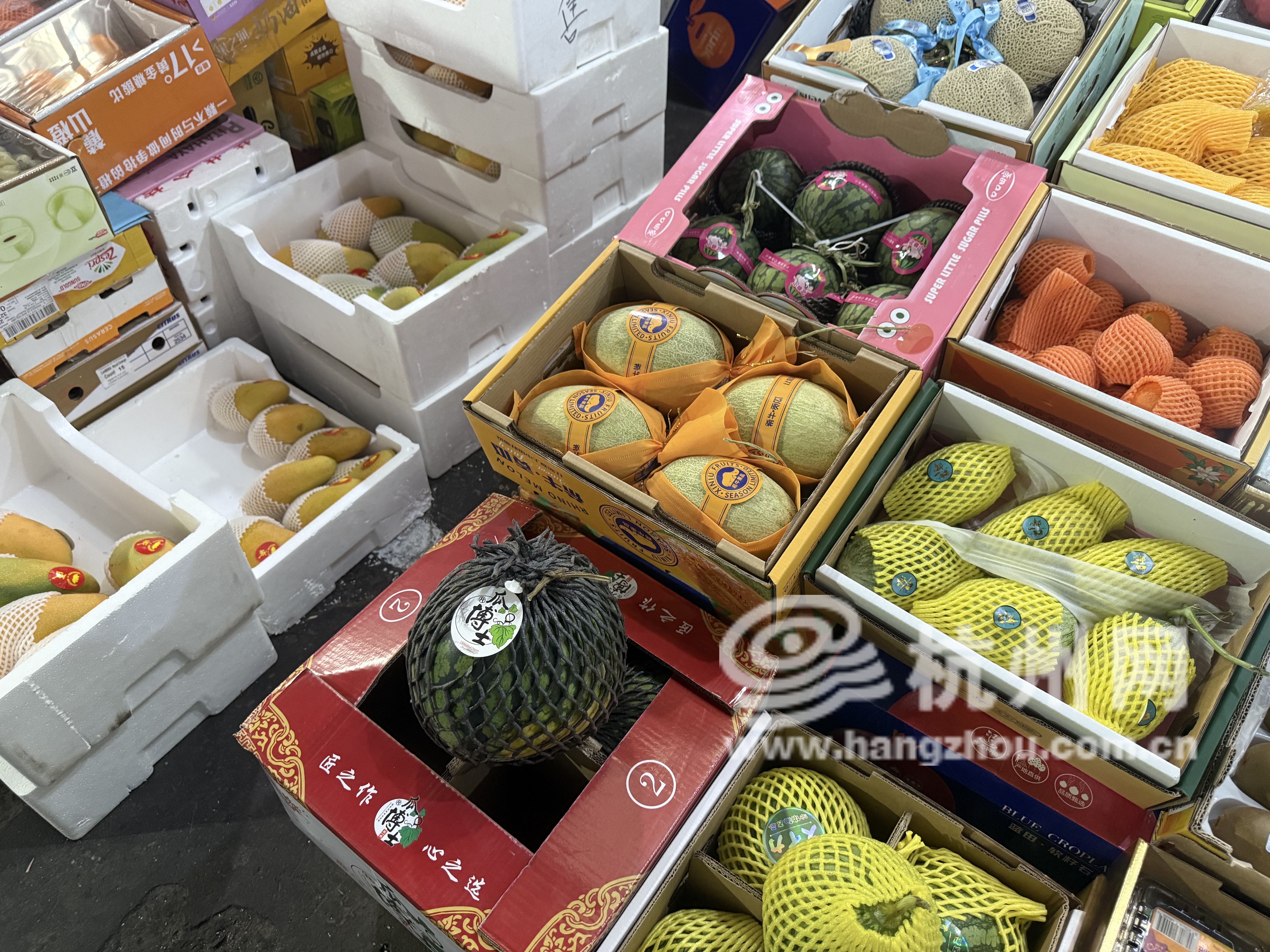 在文辉果品公司内,记者看到几乎每个摊位上都摆放着几种西瓜。蒋老板介绍道,海南麒麟瓜48元一个,早春红玉西瓜130元六个,还有一个小糖丸西瓜,每斤7块钱。“小糖丸比红玉口感更紧实一些,是吊着长的,这些产地都是海南。”