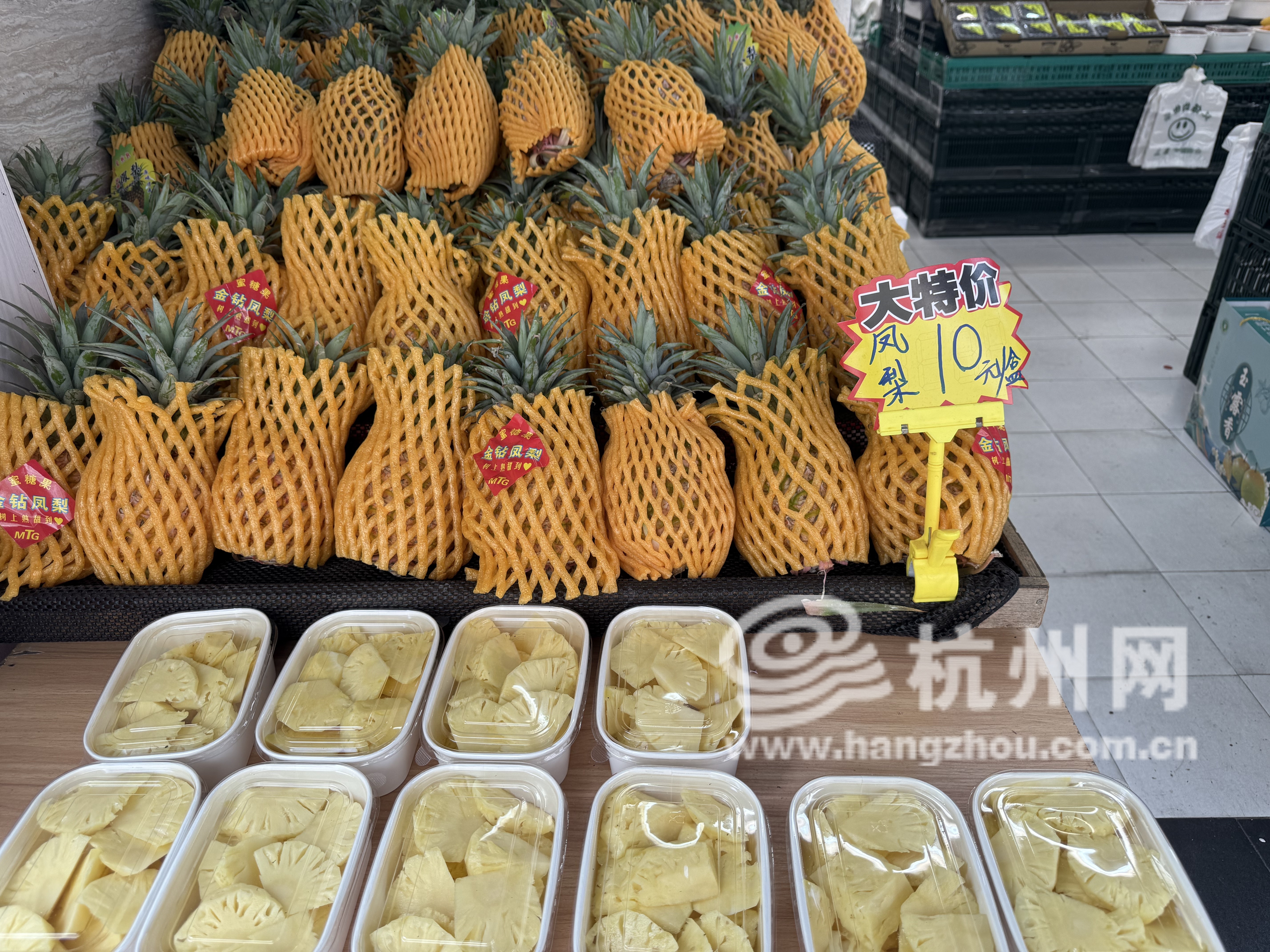 除了樱桃,记者在走访过程中发现,凤梨常常占据着显眼的位置。经过天水桥的一家水果店时,记者看到店门口摆满了凤梨和果切,老板说道:“一个凤梨正好切满一盒,价格都是10块,最近正是当季,一天能卖七八十个!”