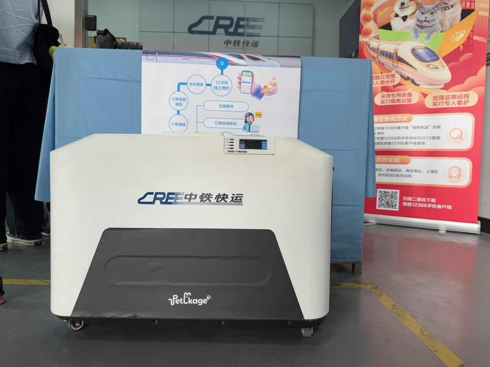 现场,工作人员在查验柯基犬的主人刘女士的身份证、乘车证明、《动物检疫合格证明》后为其办理了手续,并将宠物犬放置进专用于高铁宠物运输的运输箱——约长70厘米、宽48.5厘米、高49.5厘米的白色箱子。