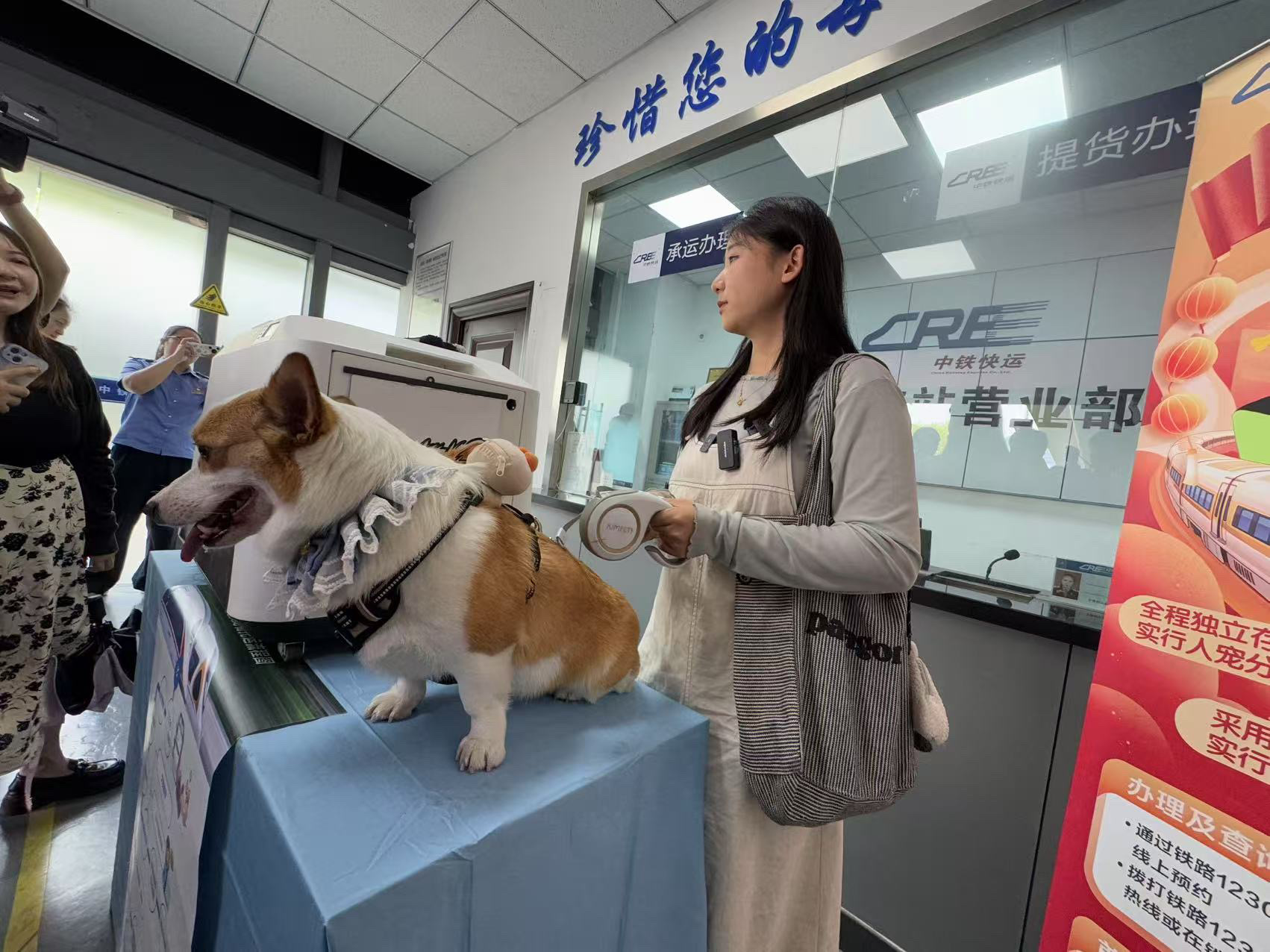 4月10日,高铁宠物托运服务正式开启,上午十点,在中铁快运杭州东站营业部内,杭州首位乘坐高铁出行的毛孩子——一只体重12千克的柯基犬将乘坐G184次列车前往南京。