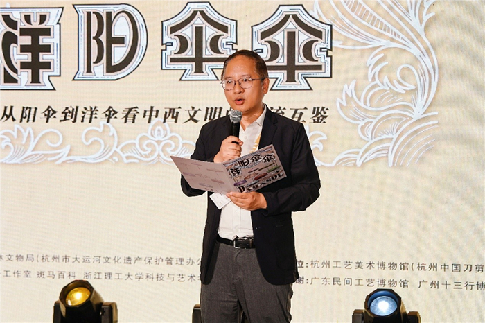 展览开幕式以《江南伞韵》舞蹈和跨时空伞秀演绎主题,杭州工艺美术博物馆馆长陈刚在开幕式上致辞。陈刚指出,阳伞为解读中西文明互鉴提供了独特视角。相较于丝绸、瓷器等传统物证,阳伞既承载着中国工艺西传的印记,也记录了西方工业技术东渐的历史,这种双向交流在西湖绸伞与西方钢骨伞的对话中得以生动展现。