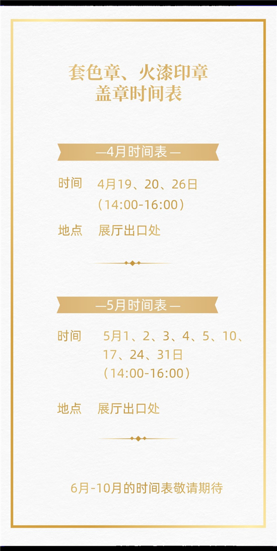 据悉,针对本次特展,工美馆特别制作了1款套色章、7款火漆印章,旨在以古典纹样定格洋伞风华,供前来参观的游客限时收集(盖章时间表见下图);展览尾厅也藏有7枚常设特色主题印章。同时,馆方也与“斑马百科”推出了联名印章。展厅还设有多处打卡点,感兴趣的市民及游客不要错过。