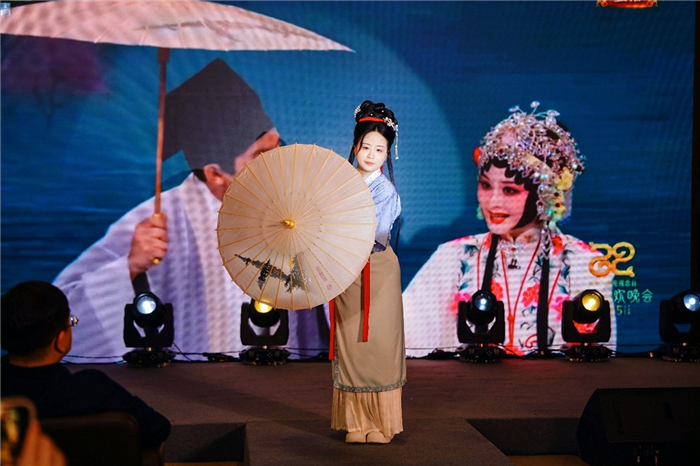 阳伞走秀环节中展示的刷花三潭印月西湖绸伞