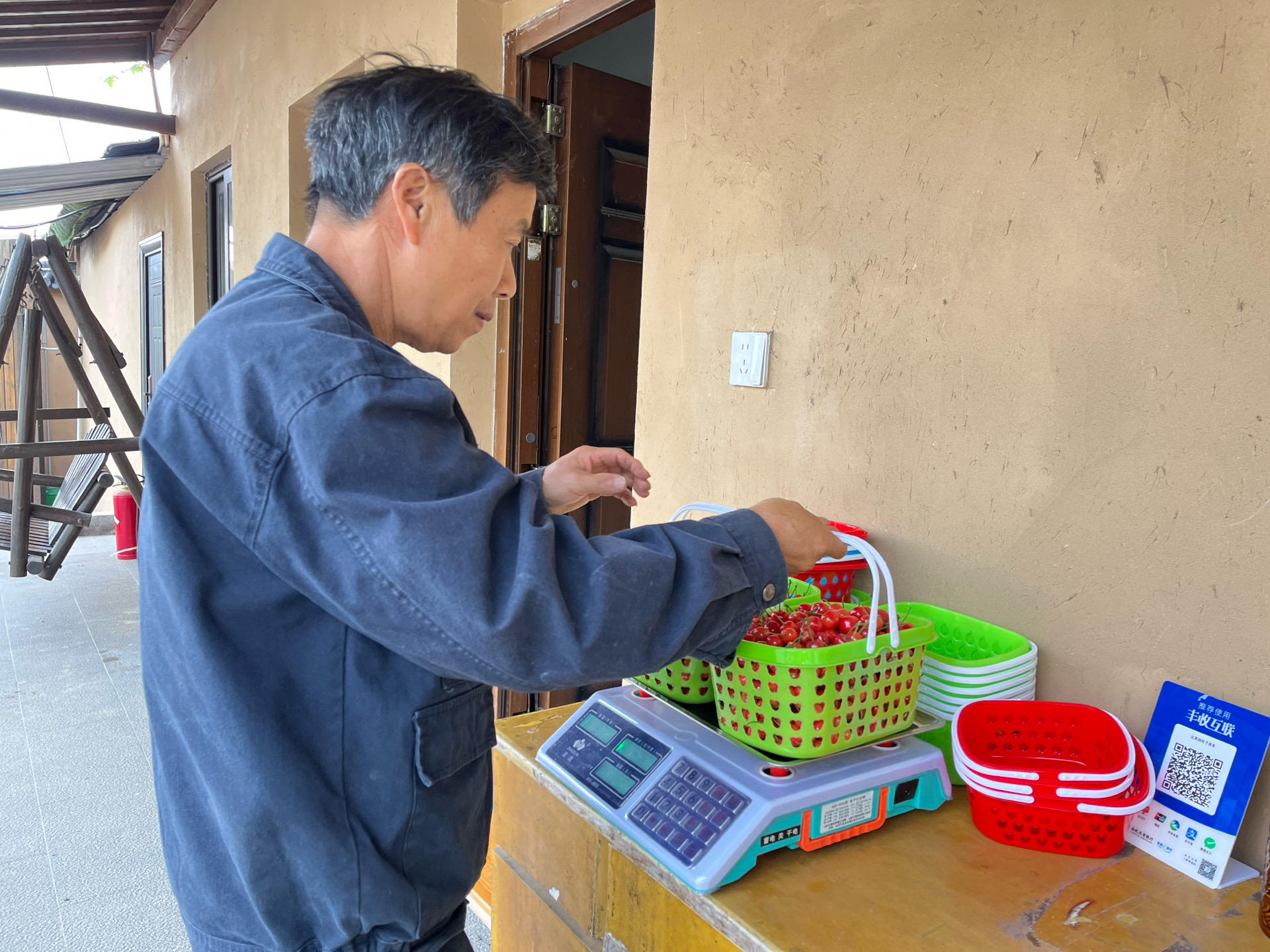 在樱桃园一侧的院子里,杨琪峰的父亲正在给顾客打包预定的樱桃,篮子里的新鲜果实同样颗颗饱满、色泽红润。他称量好后,放在塑料袋里,再小心翼翼地打上结。