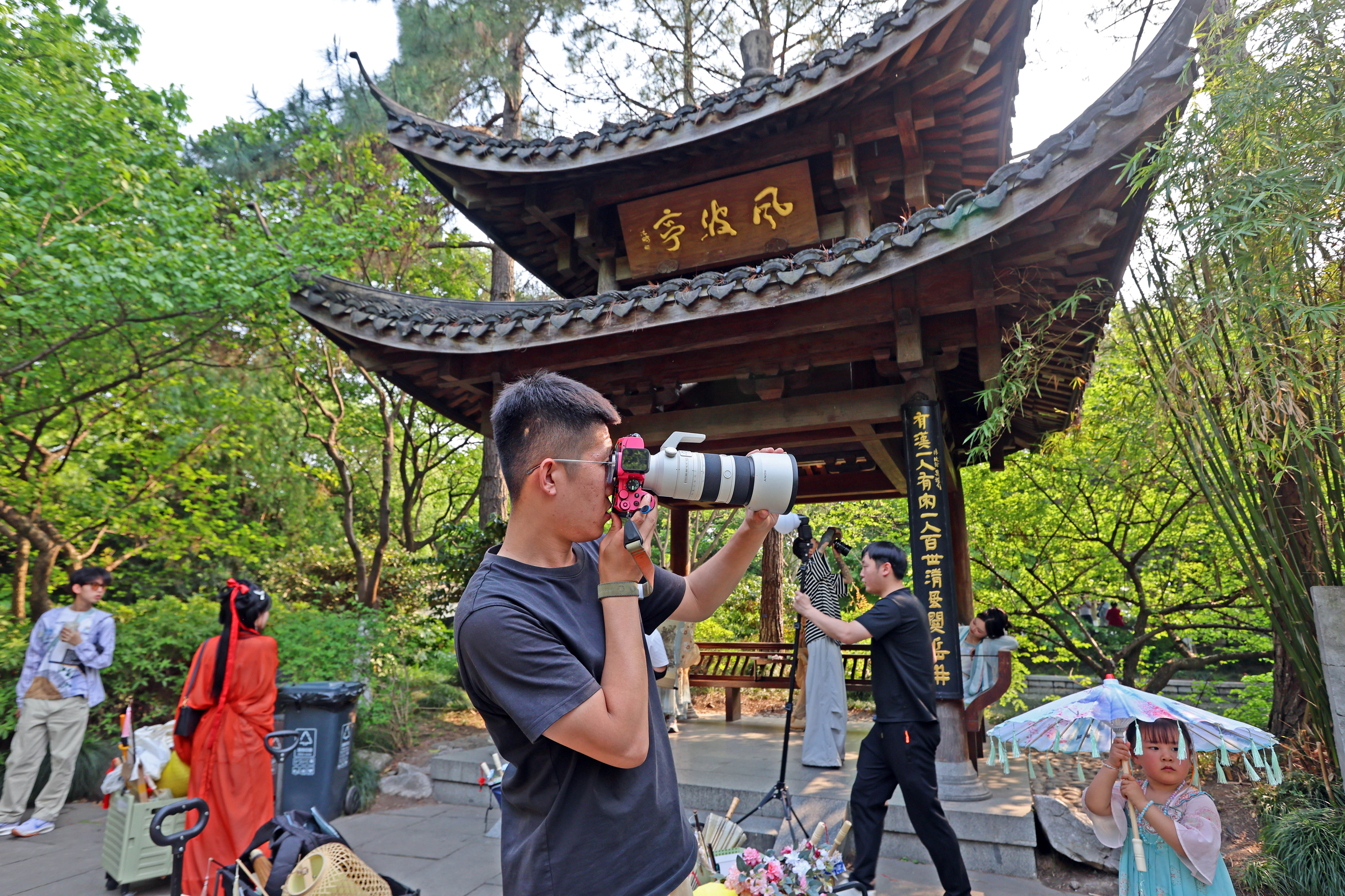4月28日12时许,西湖一公园东侧的一处幽篁叠翠之地,迎来一波又一波身着古装的年轻游客。